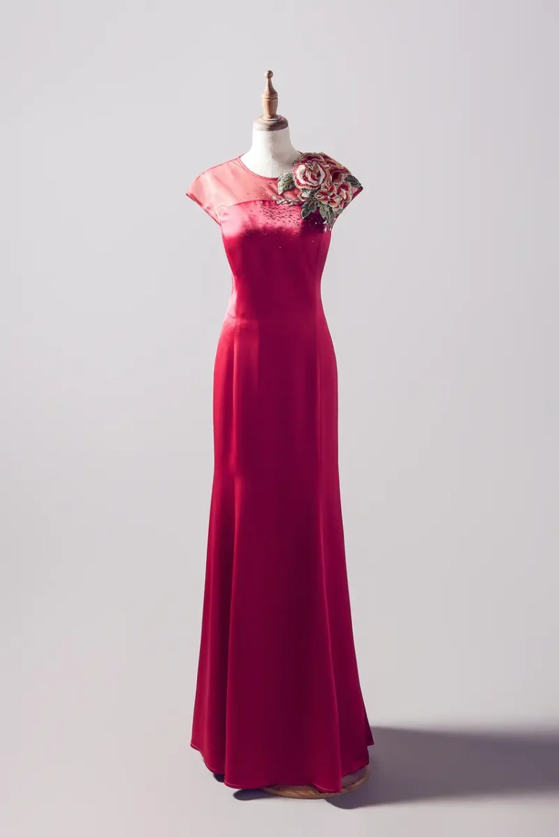 這是一件為站在人群中卻始終溫柔守候的她,所織就的禮服。紅得深不見底,像是時間沉澱出的祝福,肩上的立體花卉刺繡象徵她一生灌溉過的愛與盛放的記憶。光滑緞面在步伐間如水流轉,儘管低調,卻從不失去焦點。禮服透過小包袖與微透膚領口,柔化了端莊的輪廓,多了一份溫婉與靜靜的力道。這不是一場炫目的出場,而是一段靜默卻燦爛的自我告白——她以母親之名,深深站在愛的另一端。