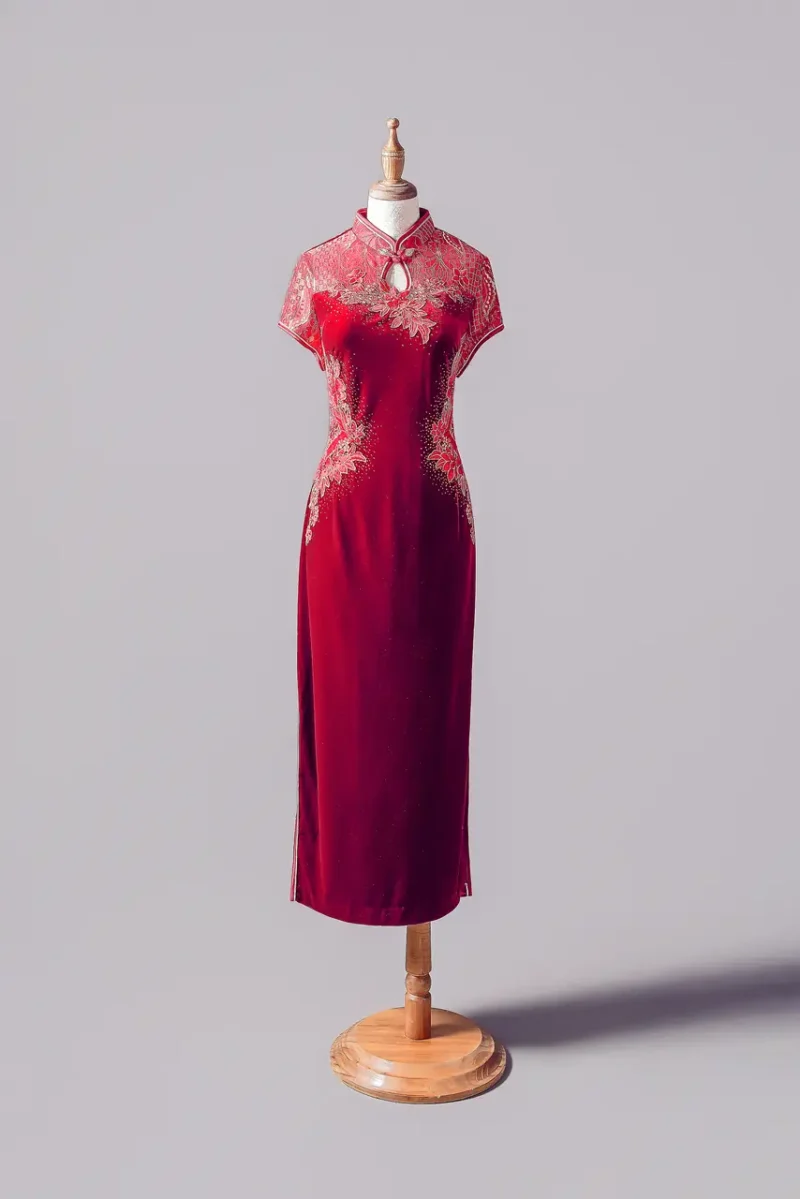 她站在紅毯的一側,細膩的蕾絲如晨光灑落掌心,絨布緊貼著歲月溫柔的軌跡。這件如同晚霞般耀眼的「鴻燦霞織媽媽禮服」,選用深紅與金線交織的絨布材質,匠心繡制出典雅的嶄新東方語彙。魚尾線條低語著一生的堅韌與風骨,小包袖與旗袍領則承載母親一世溫婉。這不是一件衣裳,而是一段篇章:記錄了由新娘步向新人生時,母親背後那舉止端莊、眼藏情淚的永恆守候。