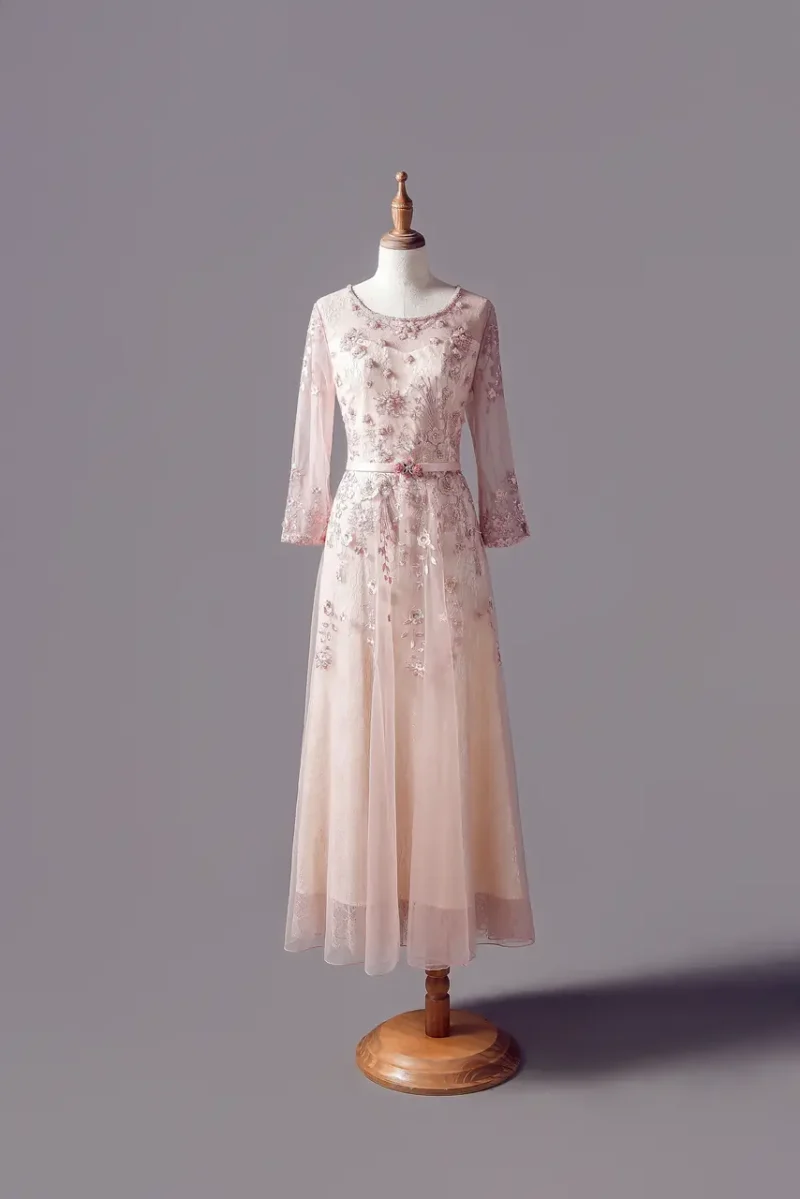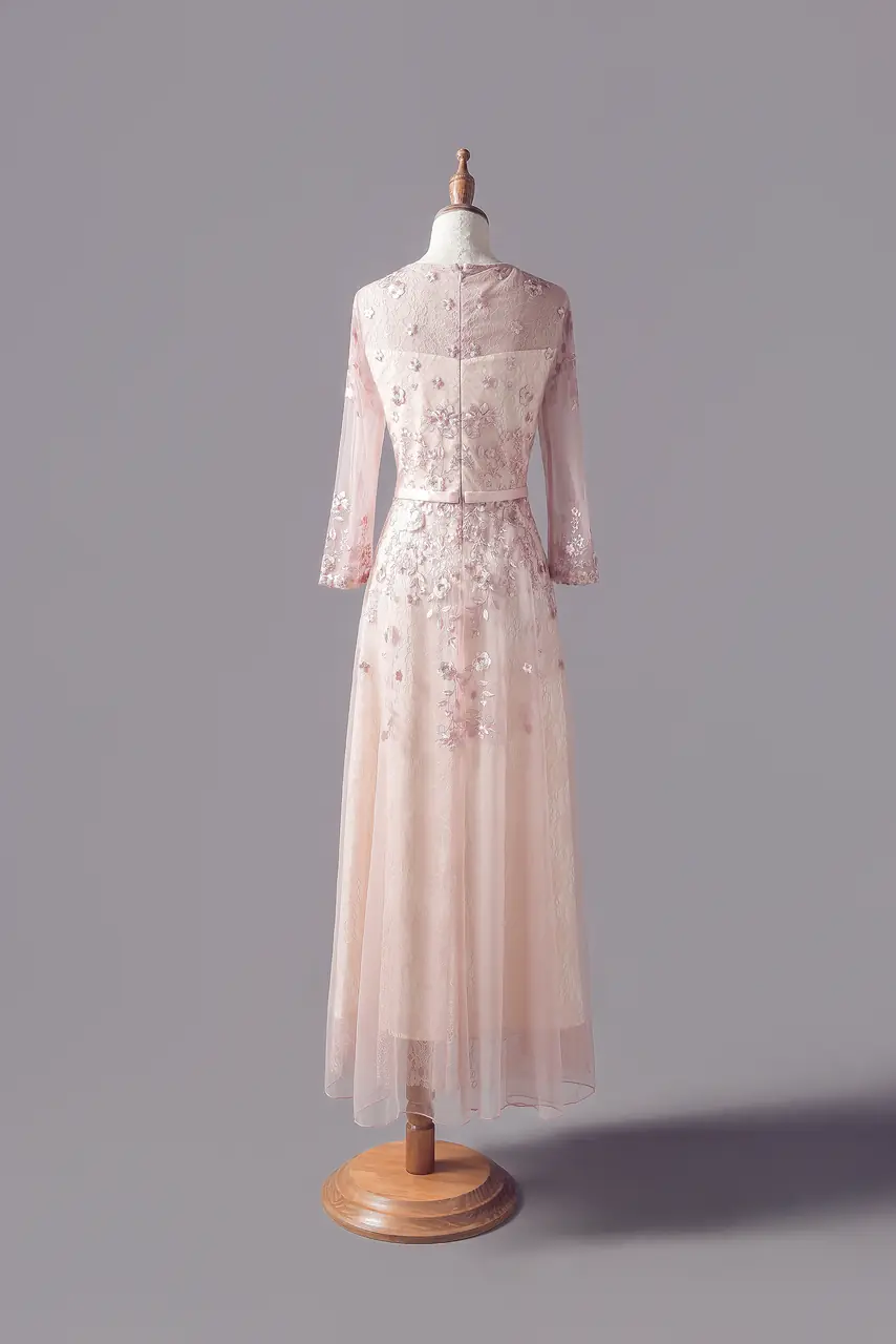 《落櫻信札》是一封母親寫給婚禮的低語。被淡粉蕾絲包覆的長袖A-line剪裁,在每個步伐間傾瀉出如花瓣落下般的儀式美感。細緻的立體刺繡彷彿書寫著春日微風裡的一段思念,是母親與孩子之間無需言語的聯繫。這件媽媽禮服不只是服裝,它是對成長的溫柔見證,是婚禮上那位溫婉而堅定的背景,靜靜承接過往,深深祝福未來。