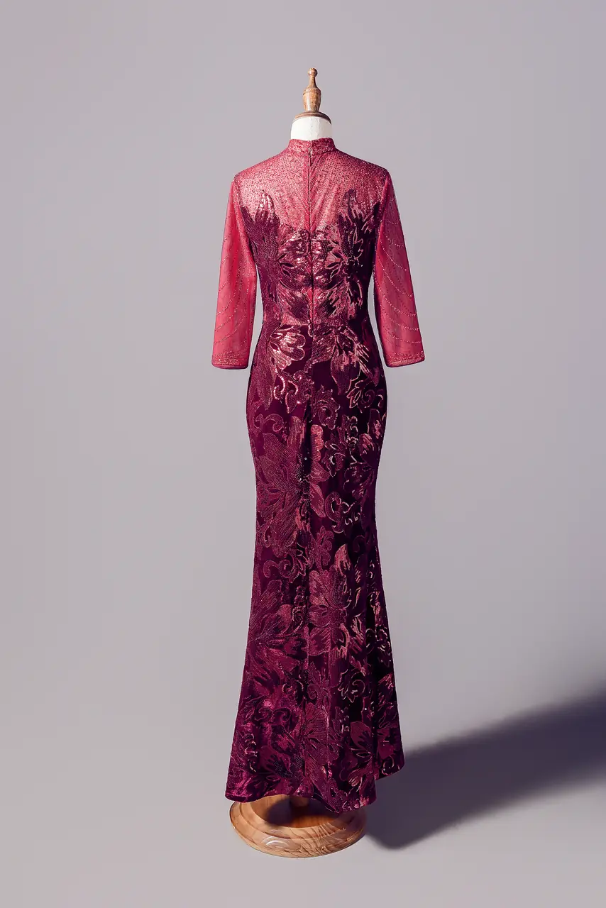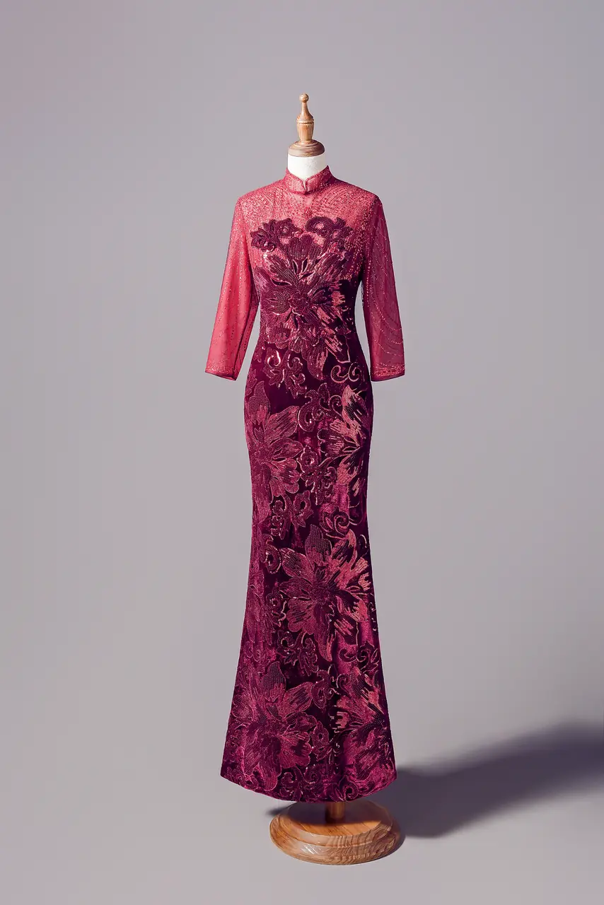 在那場深紅色的長夜裡,你是最靜定的一束光。這件「牡丹長夜媽媽禮服」,以絨布堆疊出壓抑中盛放的花影,正如母親一生的沉穩與柔韌。融合東方旗袍領的內斂與歐式魚尾剪裁的流麗,典雅不張揚,卻一眼萬鈞。透紗長袖包裹記憶的溫度,蕾絲與絨紋織出時間的韻律。在子女人生中最重要的典禮上,她不只是配角,而是溫柔而堅定的風景,是一段無聲卻深遠的詩。
