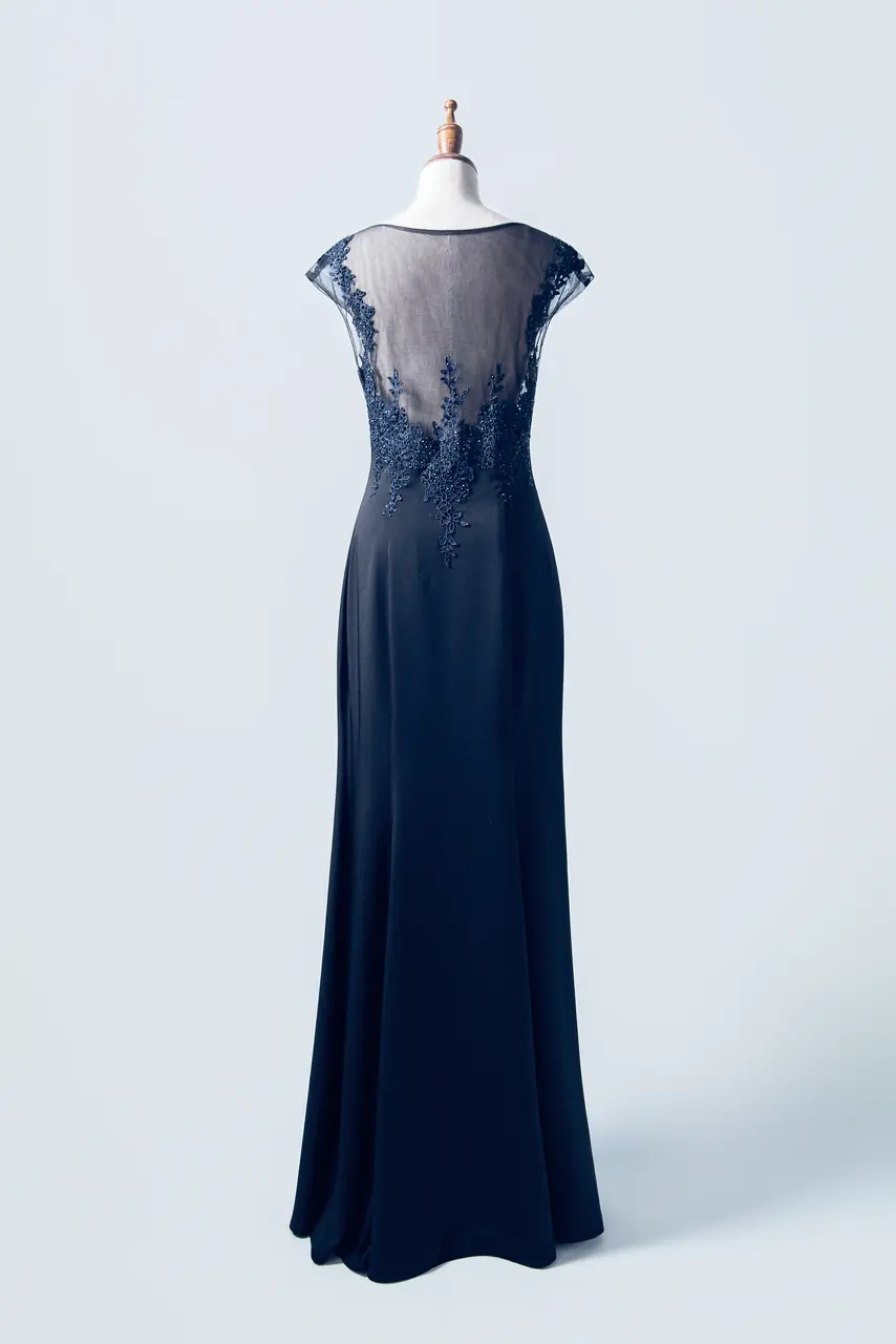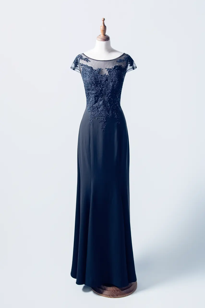 當白日的喜悅走入暮色,她,是靜靜守候的光。這件「深暮花語媽媽禮服」,以細緻黑色雪紡勾勒母親的堅定意志,柔滑的魚尾剪裁貼合身形,述說著歲月沉澱的優雅。胸前的花卉蕾絲如記憶攀附,交織著過往的溫柔與無言的祝福。小包袖散發克制之美,而圓領設計則讓整體多了親近感與雍容氣度。這不僅是一件禮服,而是一位母親,在子女人生最重要的時刻,以沉靜姿態,默默盛放的愛。
