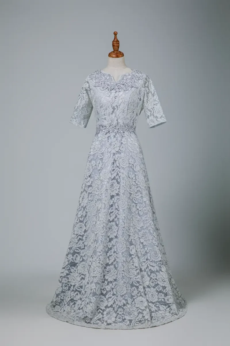 「松風灰映媽媽禮服」以銀灰蕾絲縫製,猶如晨光中霧氣漫過山林的寧靜意象。細緻蕾絲鋪陳整體,交織出如松針般挺立的氣息,藏著歲月刻劃的柔韌與溫情。A-line 裙襬舒展如風拂松枝,含蓄而堅定,完美描摹她於婚禮中的角色:不喧不搶,卻始終是愛的根。圓領短袖細節,更添一絲雅緻清澀,如同她為家所默默撐起的光影——無聲卻無所不在。
