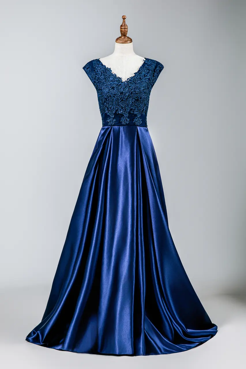 在婚禮的晨光裡,她靜靜站立——如同守護的鐘聲,自時光深處迴響。這件禮服以深藍色緞面鋪陳情感的厚度,圓潤垂墜的裙襬如大海的潮湧,沉穩卻不失優雅。蕾絲勾勒出繁花似錦的胸襟,彷彿是歲月留下的溫柔痕跡。它不只是母親穿上的外衣,更是她歲月與愛交織出的篇章,在婚禮中靜靜訴說著那些無言而深刻的情緒。穿上它,就像穿上了一段洗鍊過後的安然與光華。