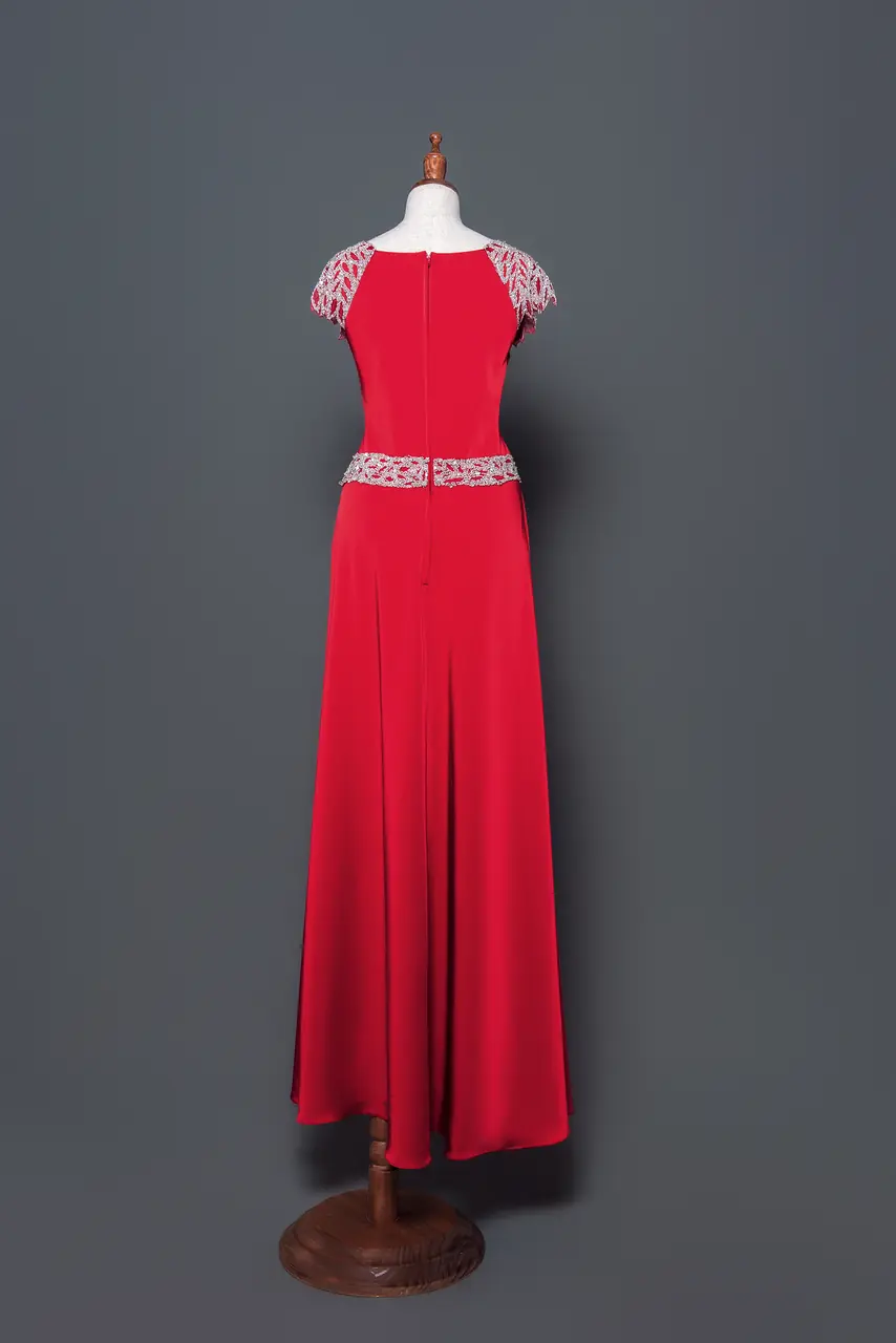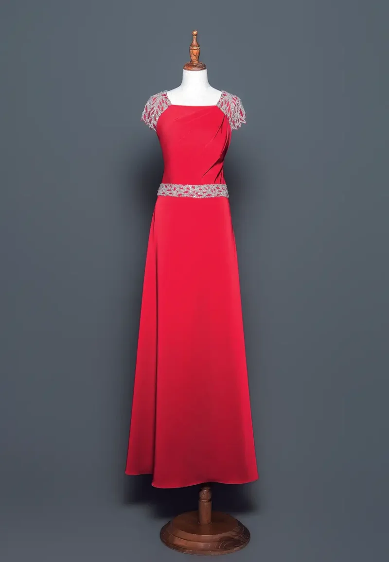 「朱檀映雪媽媽禮服」是一首低聲呢喃的詩,藏在歲月的紋理與不語的守候裡。選用鮮紅作為主色,猶如擁抱歲月厚實的情感,布料柔滑垂墜,勾勒出母親如山般渾厚的輪廓。袖口與腰間飾上銀白刺繡,彷彿雪落朱檀,在沉穩中輕輕閃爍,象徵那些不被訴說但真正照亮家的光芒。這不單是參加婚宴的穿搭,而是母親對孩子無聲的祝福與成全,是穿在身上的一段歲月情書。