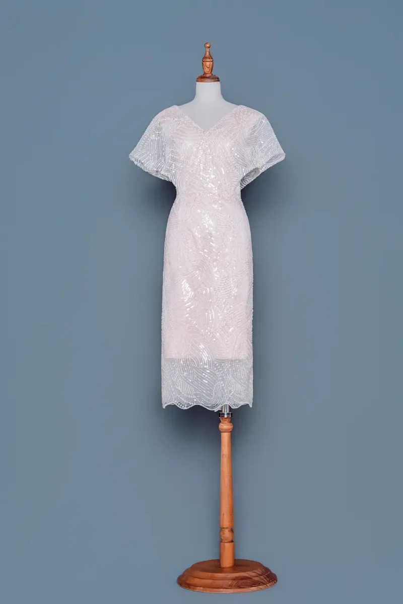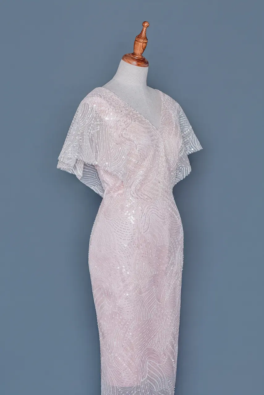 《暮羽香檳媽媽禮服》是一首靜謐時光的詩,把母親那不動聲色的優雅,織入香檳色亮片蕾絲之中。魚尾剪裁宛如海岸線上餘暉搖曳的輪廓,透紗紋理如羽翼般輕盈,隱約間如她無聲的陪伴,在婚禮的光影中溫柔盛放。V領的設計如一頁未說出的故事,沉穩而典藏,把歷經歲月的自信與從容,溫和地寫在這片緞面之上。這不只是一件禮服,更是一種回憶的體現——她在那裡,靜靜地,綻放最深的愛。