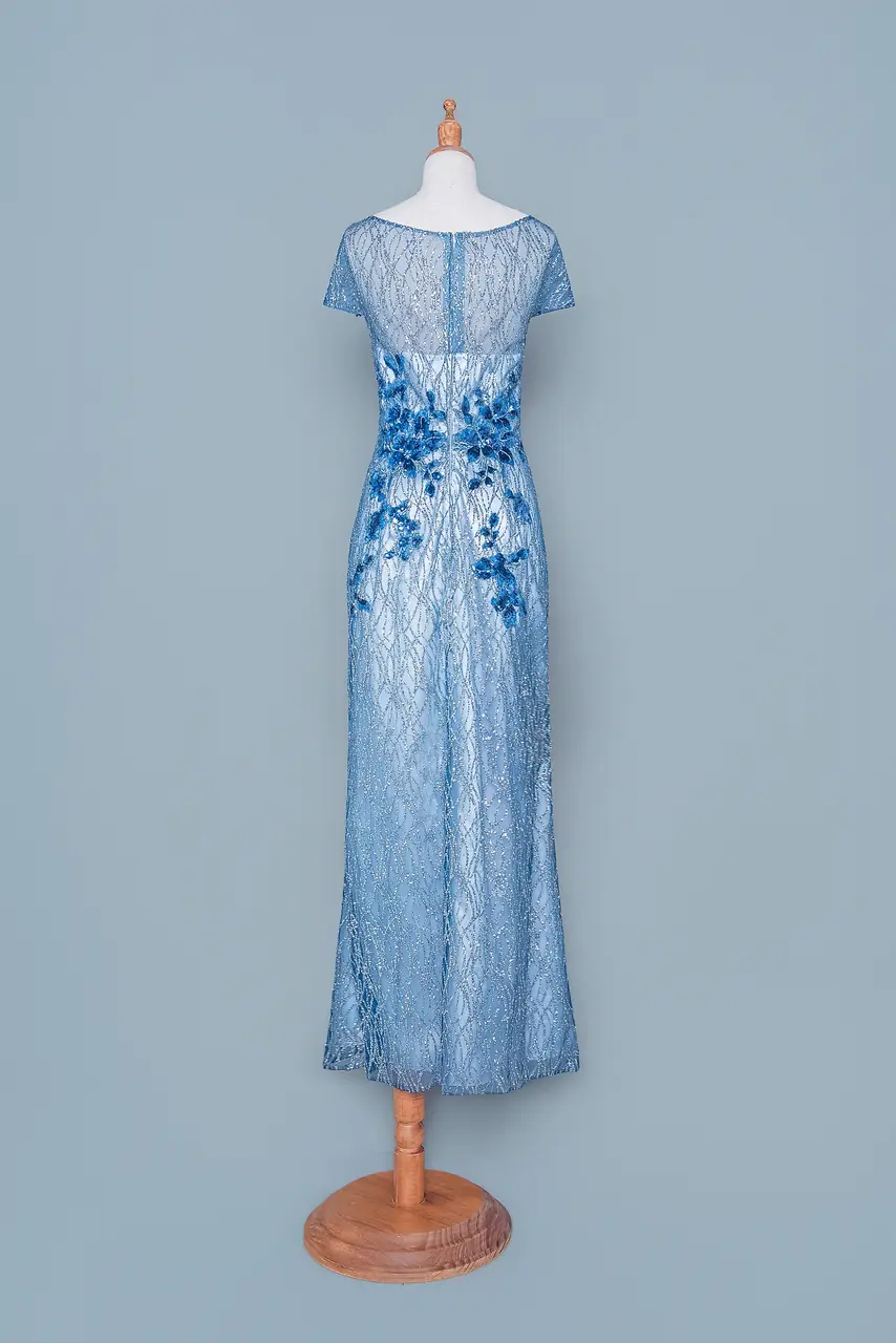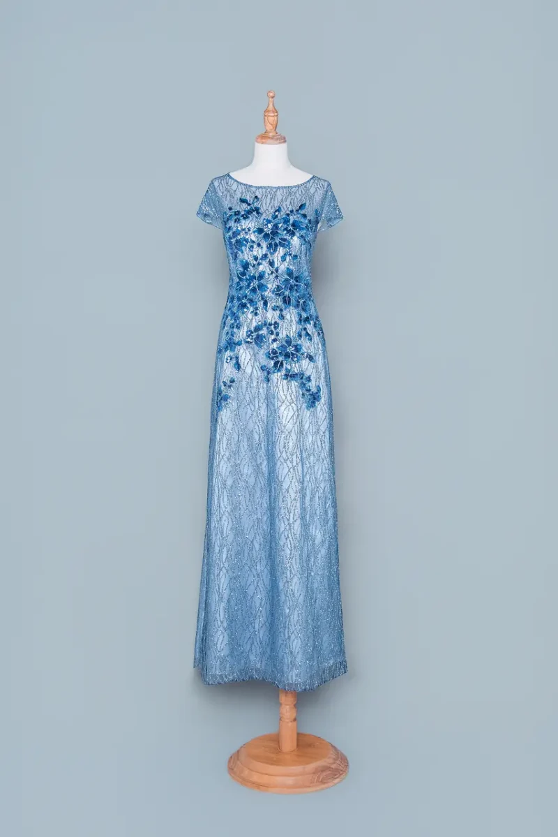 有一種母親的姿態,是在靜水深流中不言語的溫柔。『琉光聽雪媽媽禮服』以冰藍為語言,透過繁複刺繡與亮片蕾絲交織出如冬夜湖面般沉靜的光影。仿佛在婚禮這場生命交匯的時刻,她靜靜站在一角,像是守著孩子夢中的雪景,既堅定又柔軟。魚尾剪裁勾勒出溫潤線條,小包袖與圓領的設計,蘊含出尊貴卻柔和的儀態。這不只是一件禮服,是她一路走來、靜靜守候愛的身影記錄。