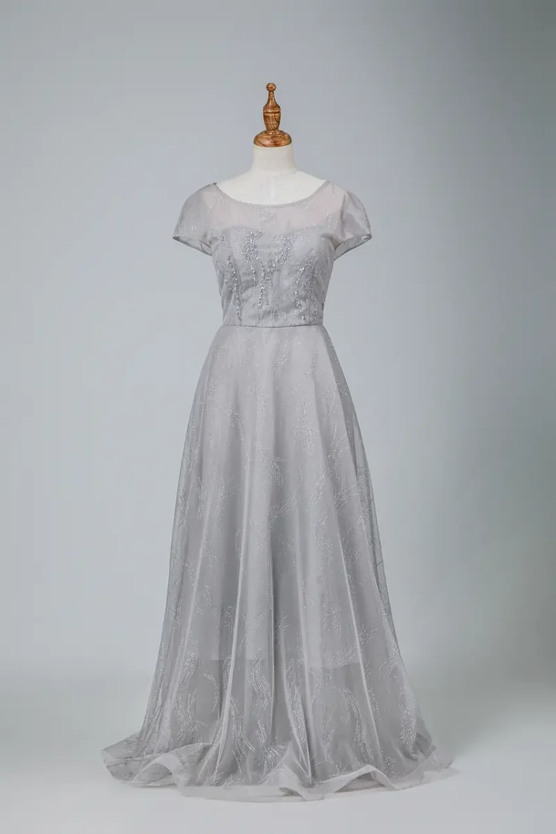 《暮羽留聲媽媽禮服》如暮晚時分輕拂的羽翼,低調中的光澤是歲月留下的溫柔。銀灰色亮片蕾絲輕輕浮現波紋狀紋理,彷彿一段段時光的軌跡,包覆溫潤的身姿。小包袖與圓領的設計,柔緩地描摹著母性的溫厚與優雅,A-line剪裁則悄然延展出她穩重卻仍婉約的心意。在女兒最重要的時刻,她選擇站在光影之外,卻用滿身光華記錄無聲的深情,讓每個回眸都藏著溫柔的詩。