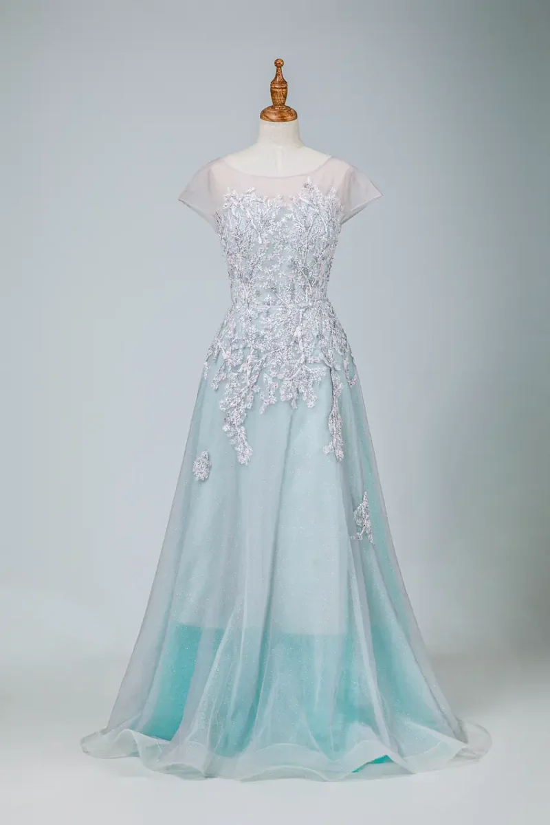 那是一位母親緩緩走過的午後,彷彿站在長河與光影的交界。遠光岸影媽媽禮服以藍灰色為基調,如被湖水渲染的暮色,覆上一層靜靜閃爍的光粉,將時間的溫柔穿在身上。細緻蕾絲如同藤蔓延展,悄悄喚起記憶深處的溫婉與堅定。A-line裙身流暢優雅,小包袖與圓領設計含蓄內斂,是她一生溫和而堅毅的象徵。這不只是禮服,更是一位女性走過歲月的光景,站在孩子婚禮上的凝視與祝福。