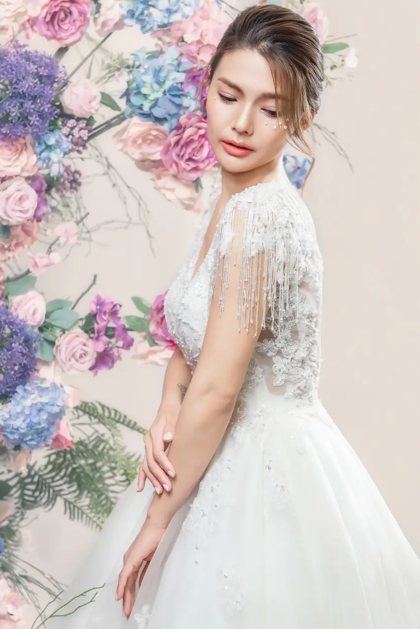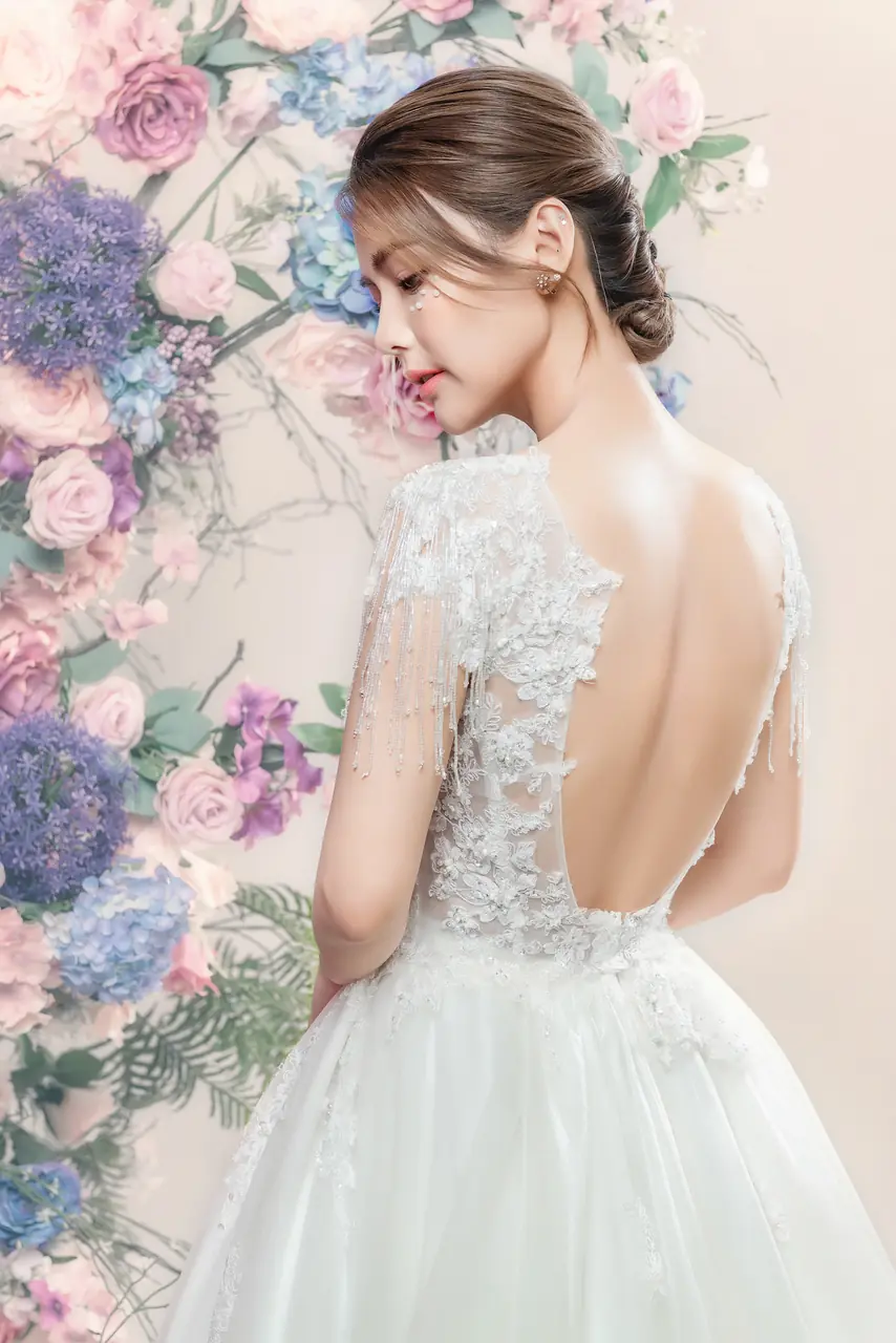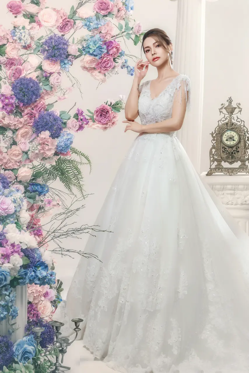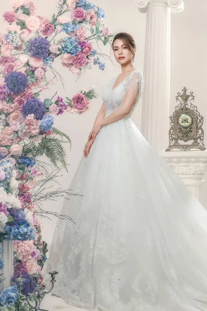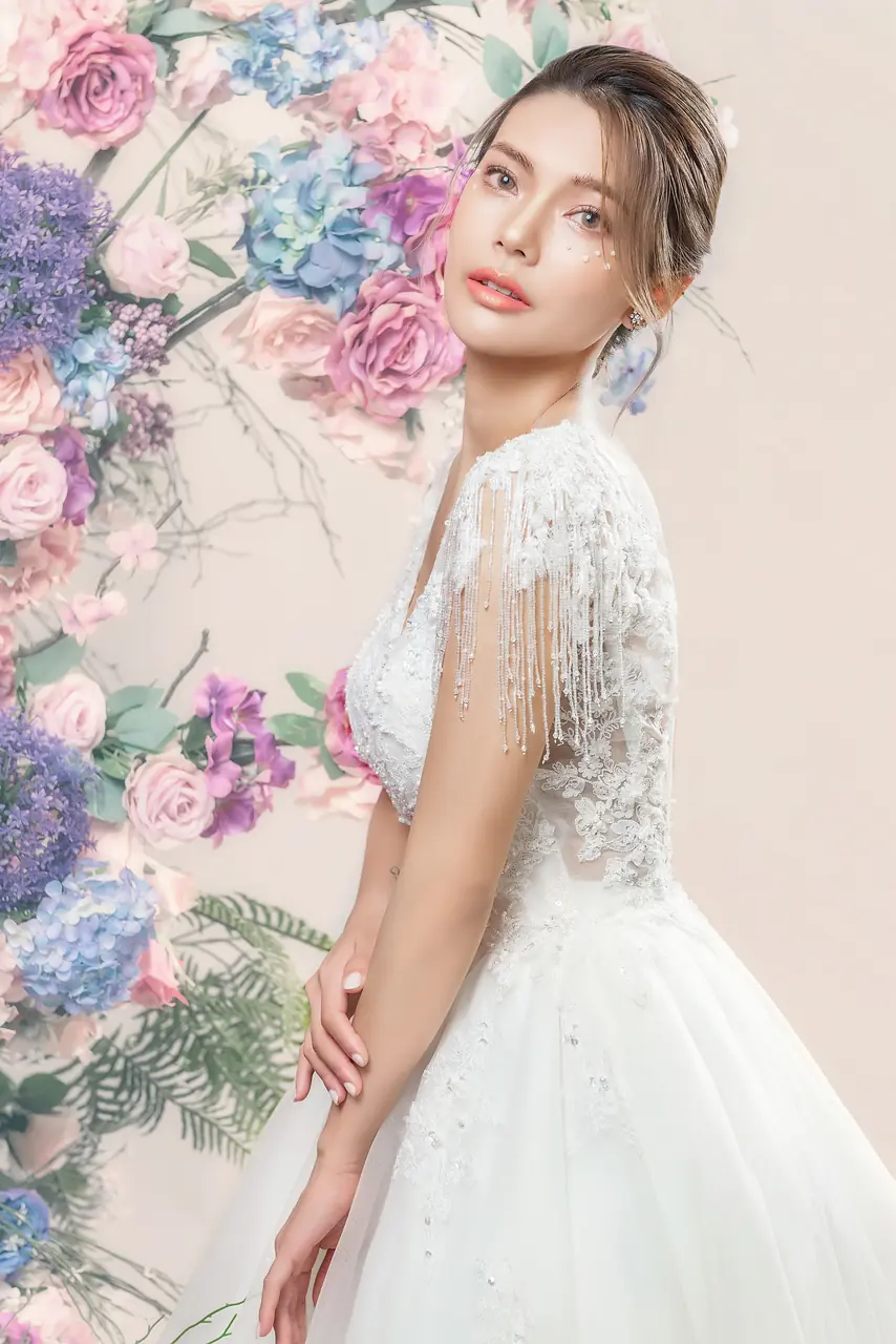 《靜語庭園白紗禮服》是獻給「存在即詩意」的新娘——蕾絲細語般攀上肩頭,輕柔的小包袖彷彿花間拂過的風,用純白勾勒記憶最柔軟的輪廓。V領簡約而莊嚴,引領視線沉入愛意的深海;溫柔澎裙若晨霧輕盈散開,每個步伐都沉浸在花影與鐘聲交織的午後。這不只是一件婚紗,而是一座凝結情感的私密庭園,安靜,卻深深呼喚著愛的名字。