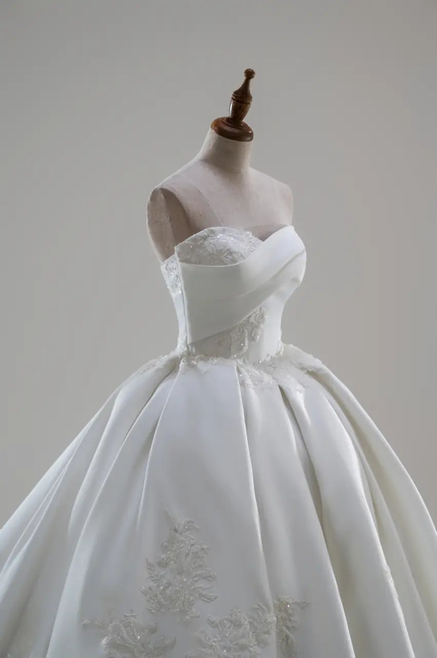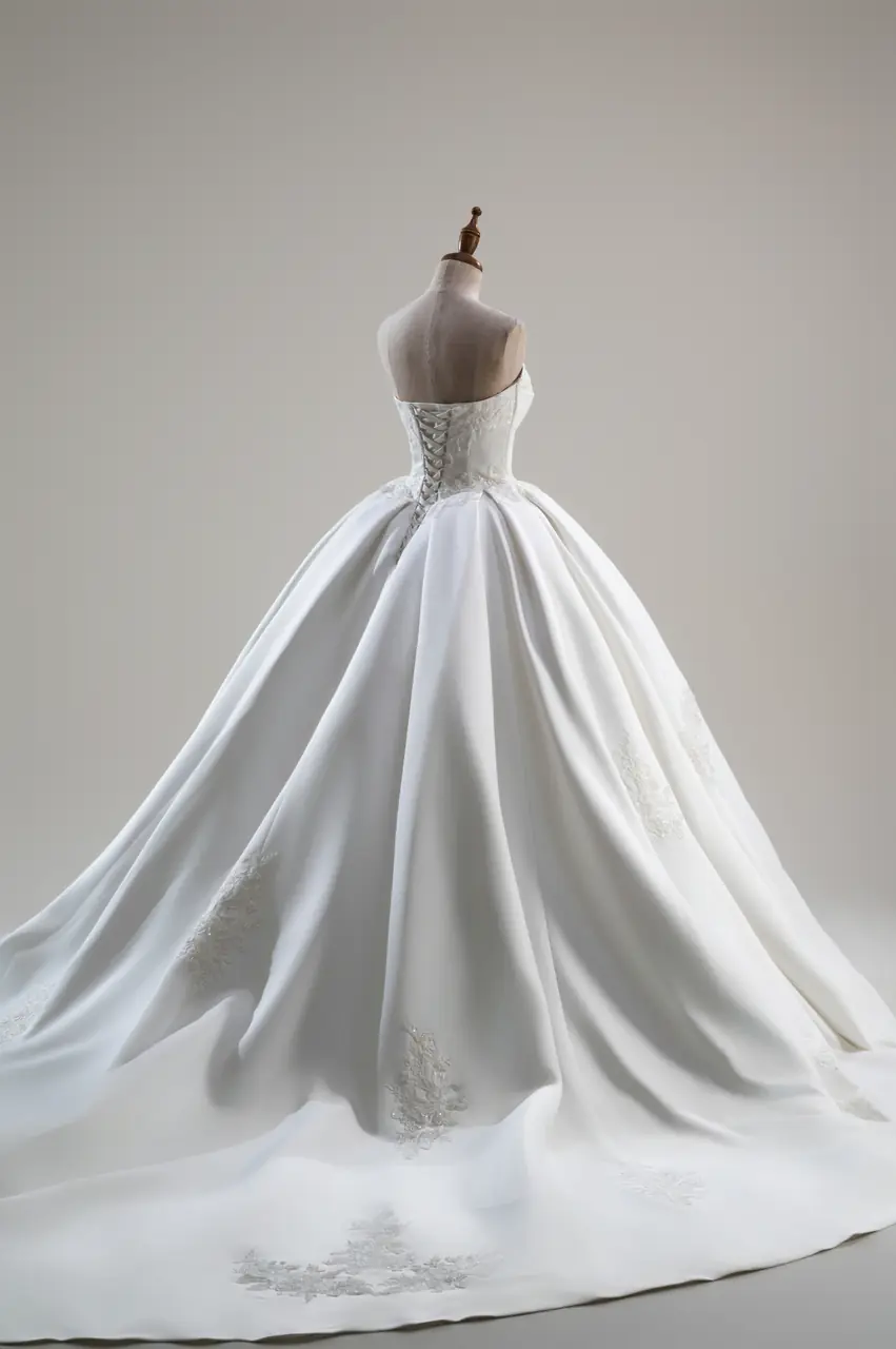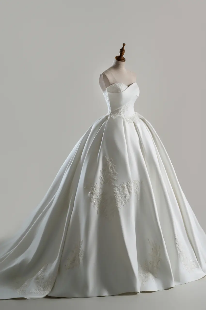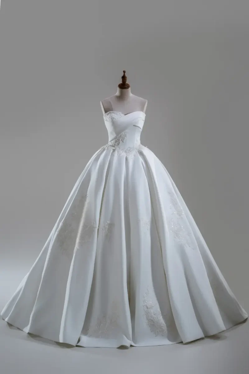 《雪域沉語白紗禮服》是一次純白世界的呢喃,在視覺的沉靜中蘊藏澎湃情感。緞面質地映出低溫光感,如同晨霧未散的山谷,一切聽起來如此寂靜卻深情。桃心領口輕柔收攏心事,無袖設計讓靈魂無拘伸展;裙擺展開如雪落林間,靜靜訴說等待多年的誓言。這件婚紗不只為某一刻的華麗,它屬於一場未竟的自我尋回——那個在你內心雪原上,始終溫柔呼喚的名字。
