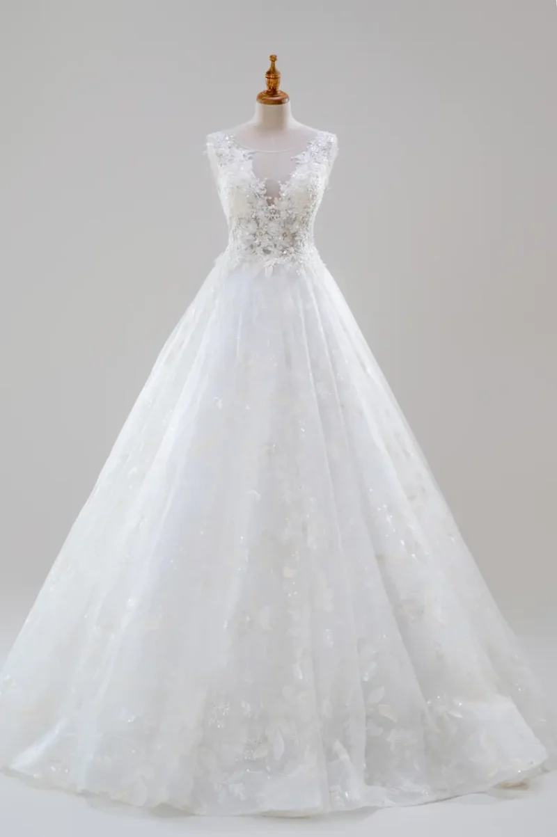 這是一件帶著森林呢喃的白紗,名為《林語情書》。禮服輪廓如風中書頁,輕盈展開。無袖設計與V領剪裁勾勒出一種脆弱又堅定的純粹,如同穿越晨霧的枝葉輪廓。蕾絲上點綴細緻立體的葉片與花卉,彷若春日山谷悄然綻放的低語,每一朵皆像從樹影中躍出的詩句,只為在光影之中,佐證一段私密而忠誠的承諾。這件白紗不是禮服,而是一場與記憶共舞的儀式,將你寫進那座無人知曉的林中日記中,永不褪色。