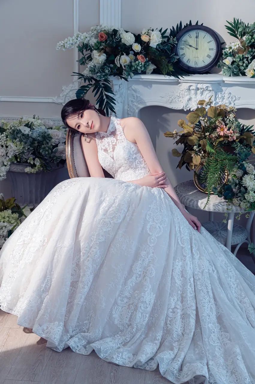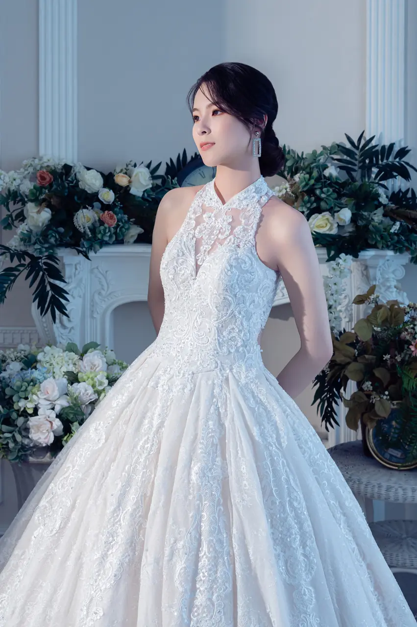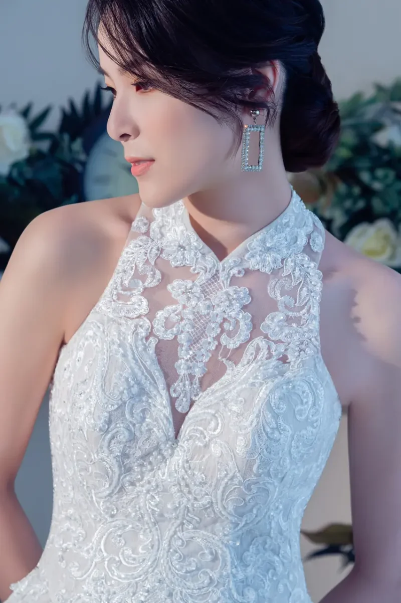 在日光與幽影交疊的午後,她步入那座舊時花園。沒有風,卻有蕾絲如白羽輕颺。這件名為「寂羽交頸」的白紗,以削肩設計與圓領交錯出莊嚴如詩的靜默姿態。繁複蕾絲盤繞胸口,彷彿低語著藏在內心深處的呢喃。它不炫目、不嘩然,只為那些相信靜謐才最珍貴的靈魂而生。這不是一場婚禮的開端,而是靈魂深處一次無聲的自我宣告。