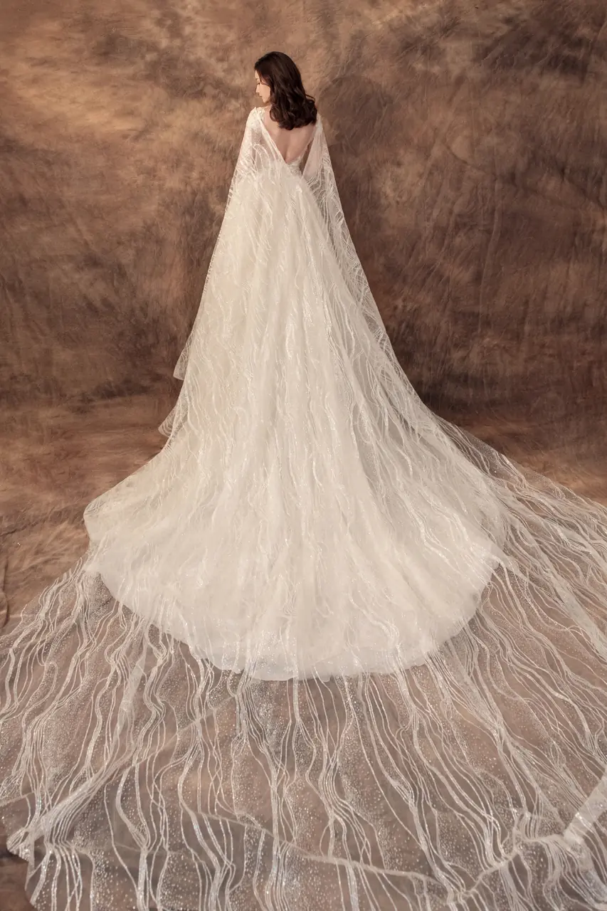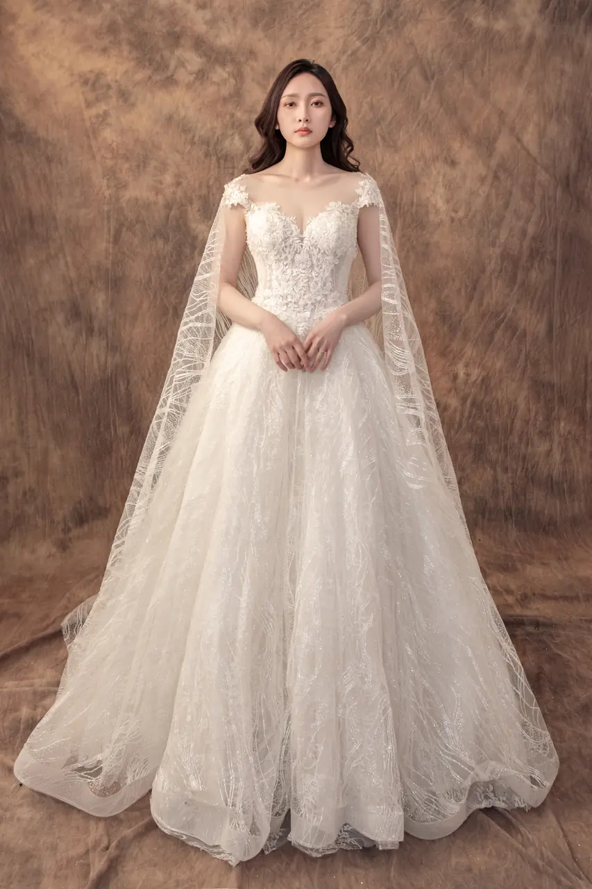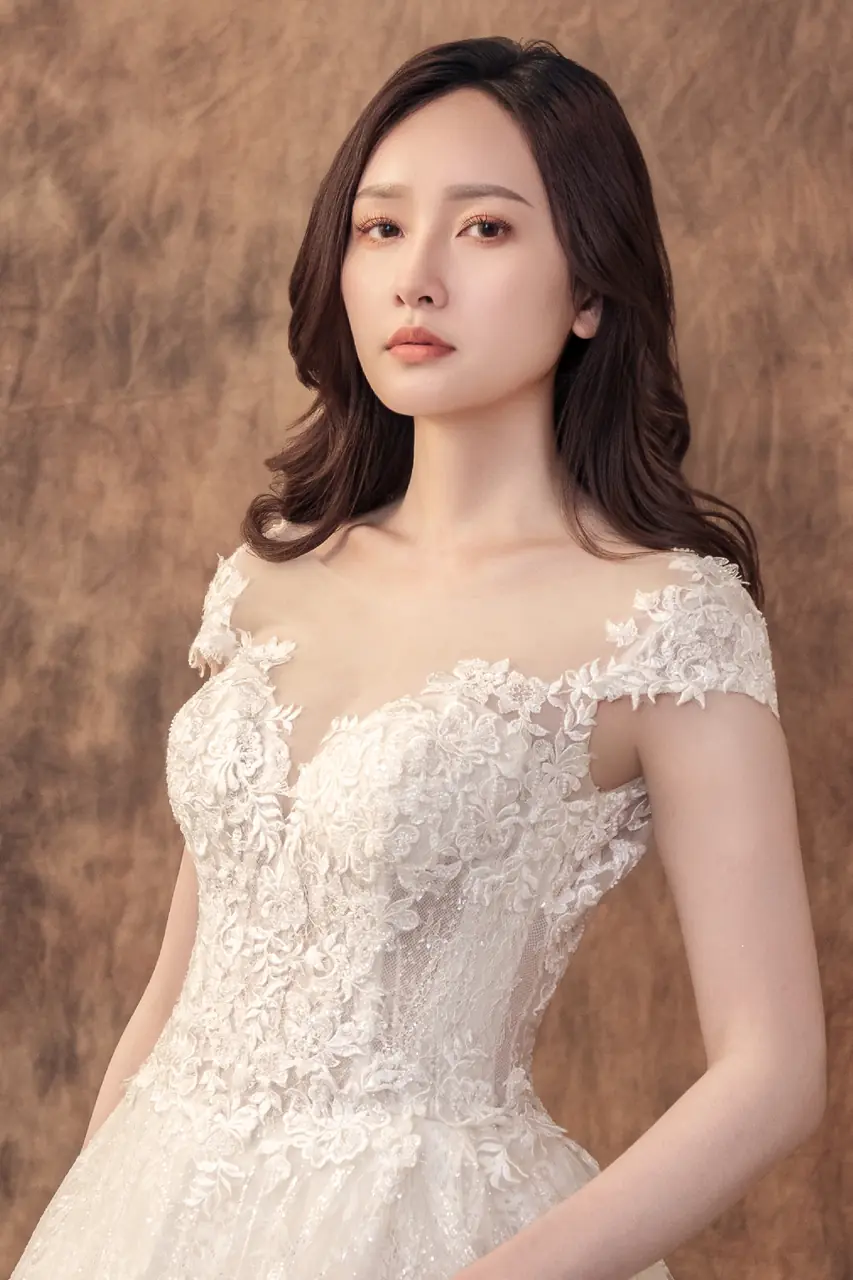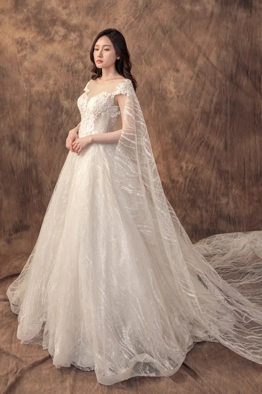 她站在寧靜山坡的邊緣,空氣中仍殘留冬日最後一縷冷意。這件《雪堤聆語白紗禮服》彷彿為記憶中的雪境而生——以象牙白為基調的蕾絲,如薄雪輕覆枝頭,繁複而不沾塵。桃心領與卡肩輪廓,勾勒出柔軟而堅定的心意,象徵愛情中不曾動搖的本質。她的裙擺如堤岸輕瀉,隨風低語,靜靜訴說一場曾經等待、如今盛開的深情。這不僅是一件婚紗,更是屬於那些深知愛的重量,卻仍願輕柔擁抱的人。