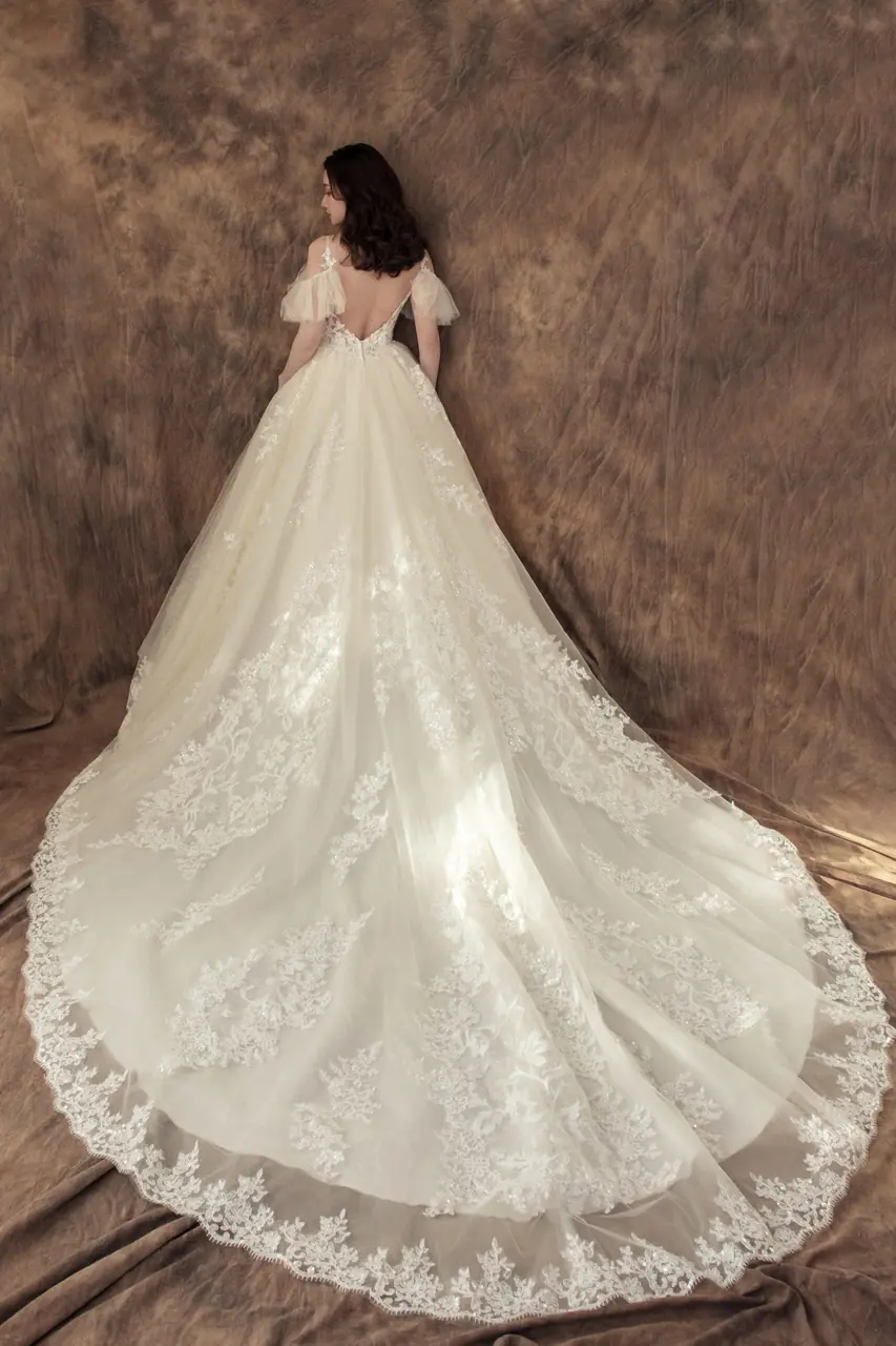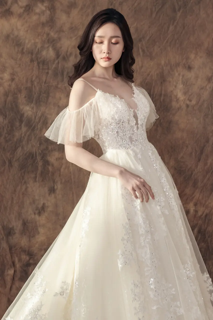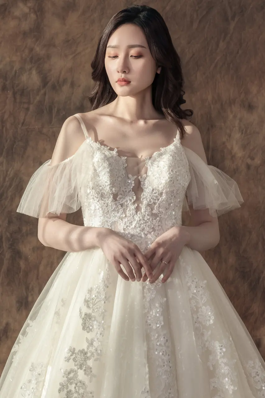 《沉香澤》是一場深藏於靜謐之中的情感低語。象牙白的蕾絲交纏而生,如風吹過林間池畔的輕顫,細肩帶與活動式卡肩設計勾勒一種不言的柔軟力量。彷彿身處午後室內褐色光影中,木質香氣繚繞,薄紗裙擺輕覆空氣,如昔日書信裡未說出口的愛意——不炫目,但深刻,正如最深的承諾從不需宣告。這件禮服適合那些善於傾聽自己心跳的靈魂,願在靜聲中,迎來命運的回響。