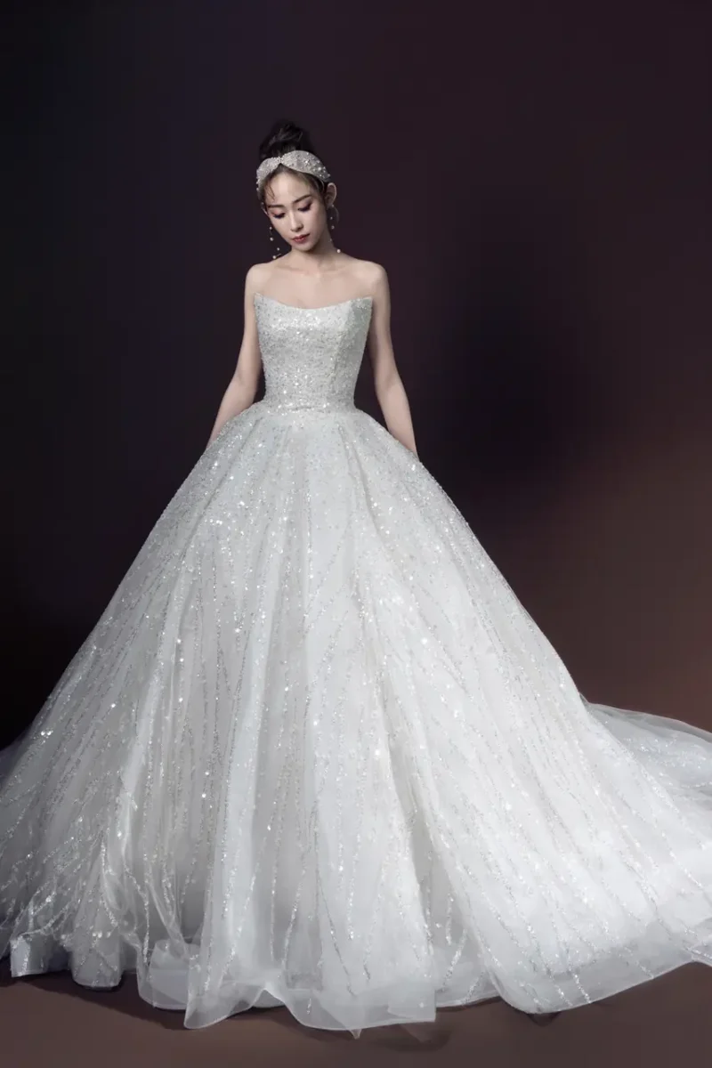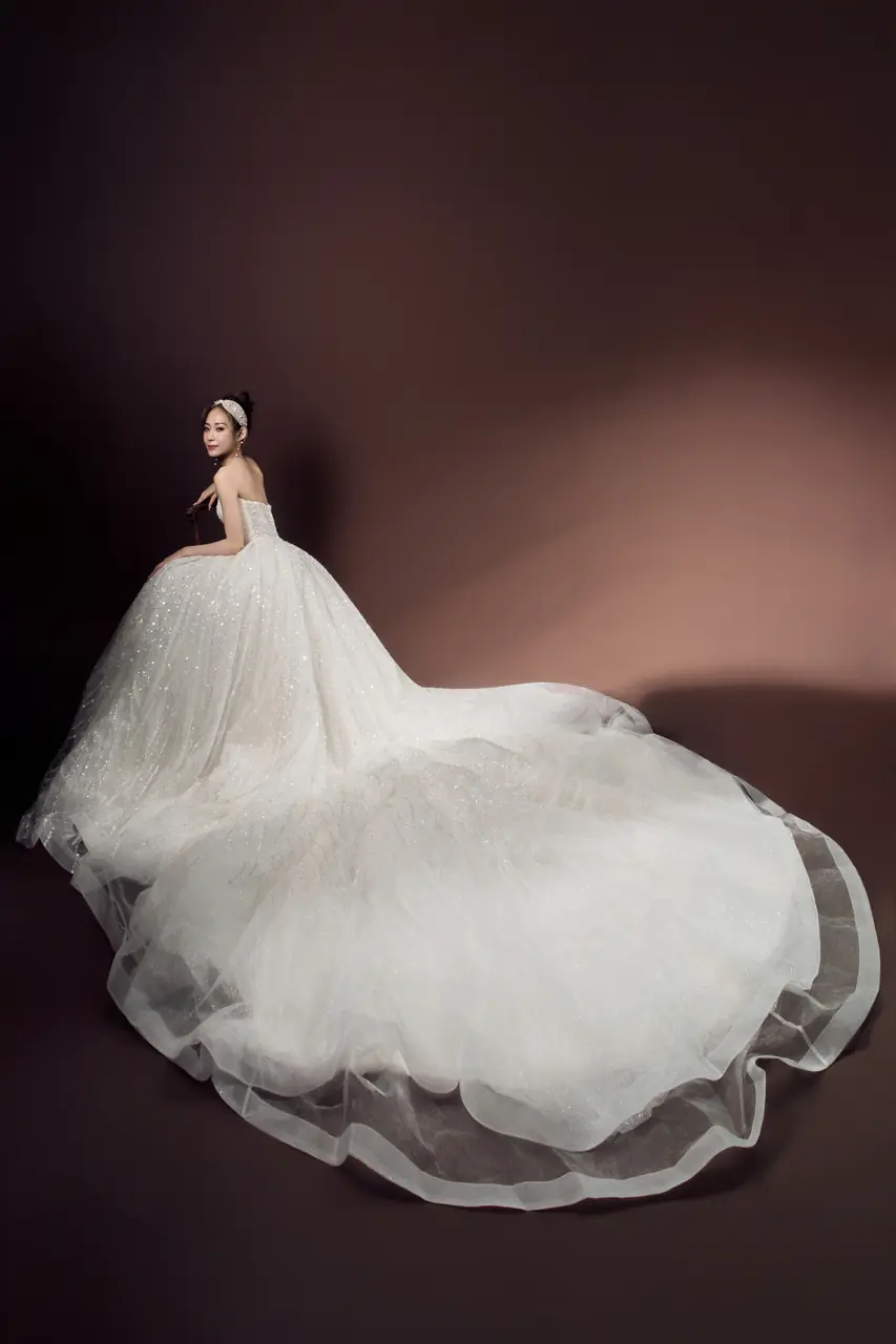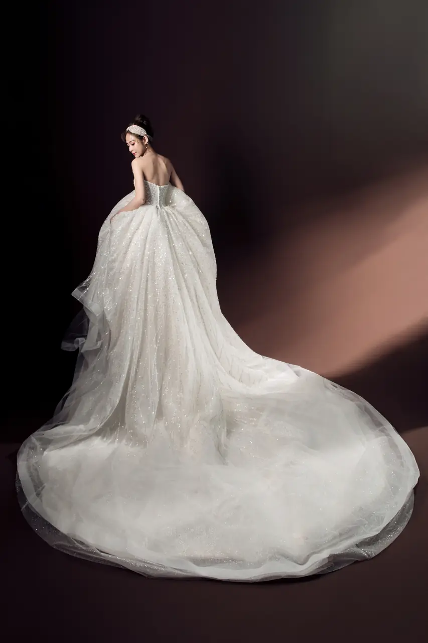 她站在靜謐之中,彷彿整個宇宙停止運轉,只為映照她裙擺上流轉的星光。《靜語繁星白紗禮服》以無袖的純白輪廓,搭配特殊立體剪裁與滿佈的亮片紗,如夢似幻卻毫不虛飾。在柔光與暗影之間,它是一種內斂的光輝,如同情感最深處無需言說的悸動。這件禮服不是為了目光設計,而是為了記憶——那一刻,她讓時間靜止,讓愛發聲。