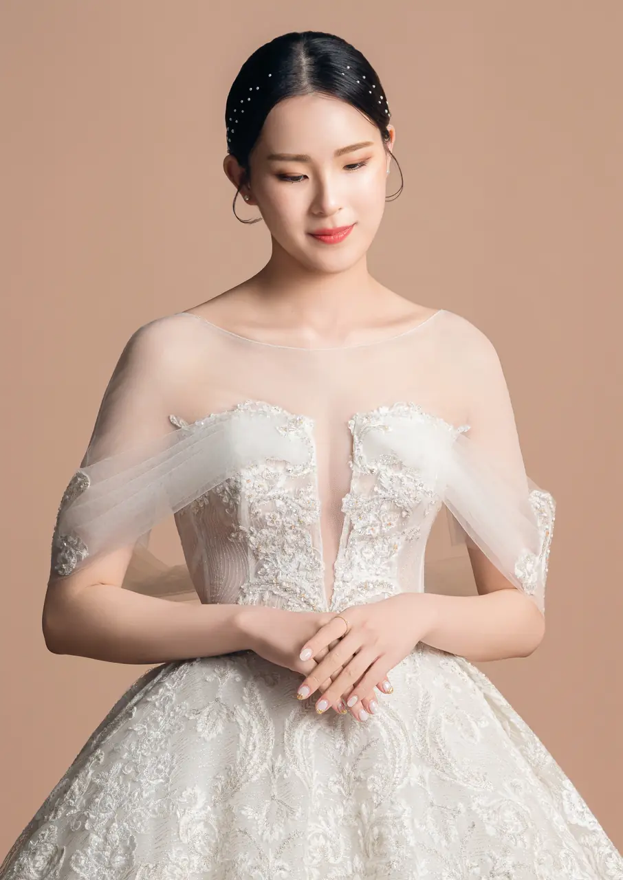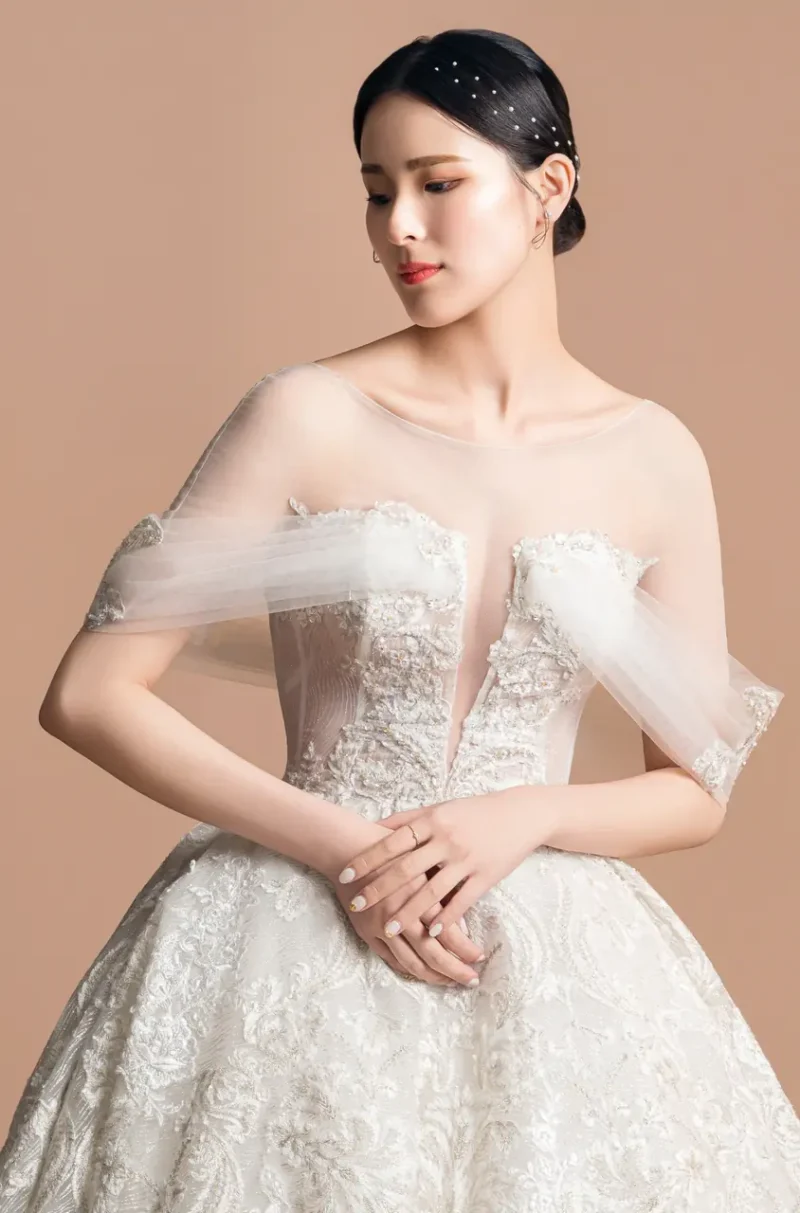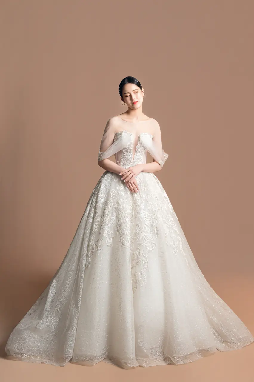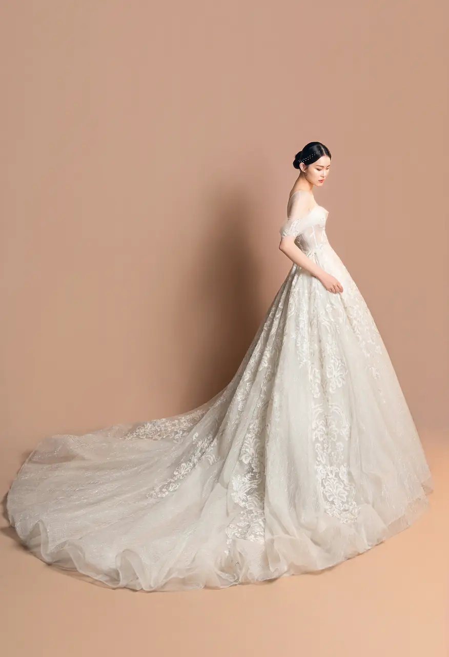 《沉香軌跡白紗禮服》是一段關於回聲的記憶書寫——以香檳色為情感的底調,如微光滲染的信箋,述說著一場柔軟卻不容抹滅的緣分。細緻的蕾絲彷彿老屋簷下的花窗,透著絲絲懷舊,V領與卡肩剪裁,如同花園午後的低語,引人窺探藏於心底的靜默激情。澎裙線條帶來古典的儀式感,輕裹一段從容的等待時光——某個回頭的瞬間,她終於站在了屬於自己的句點,也是開始。