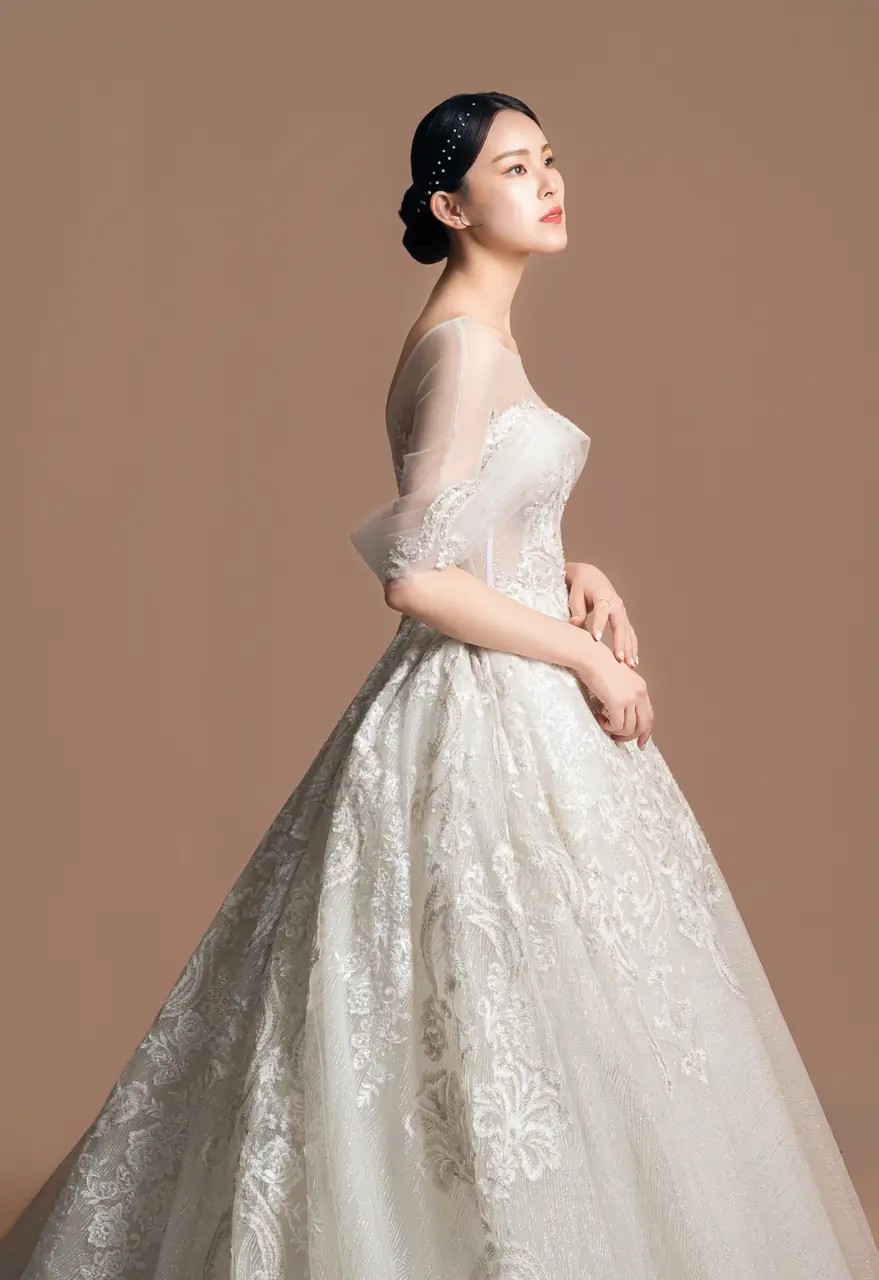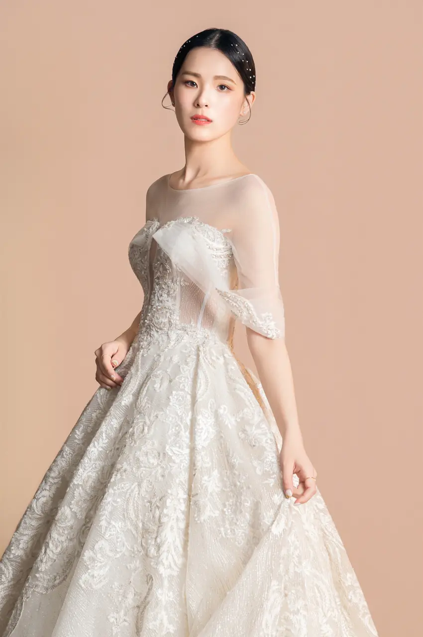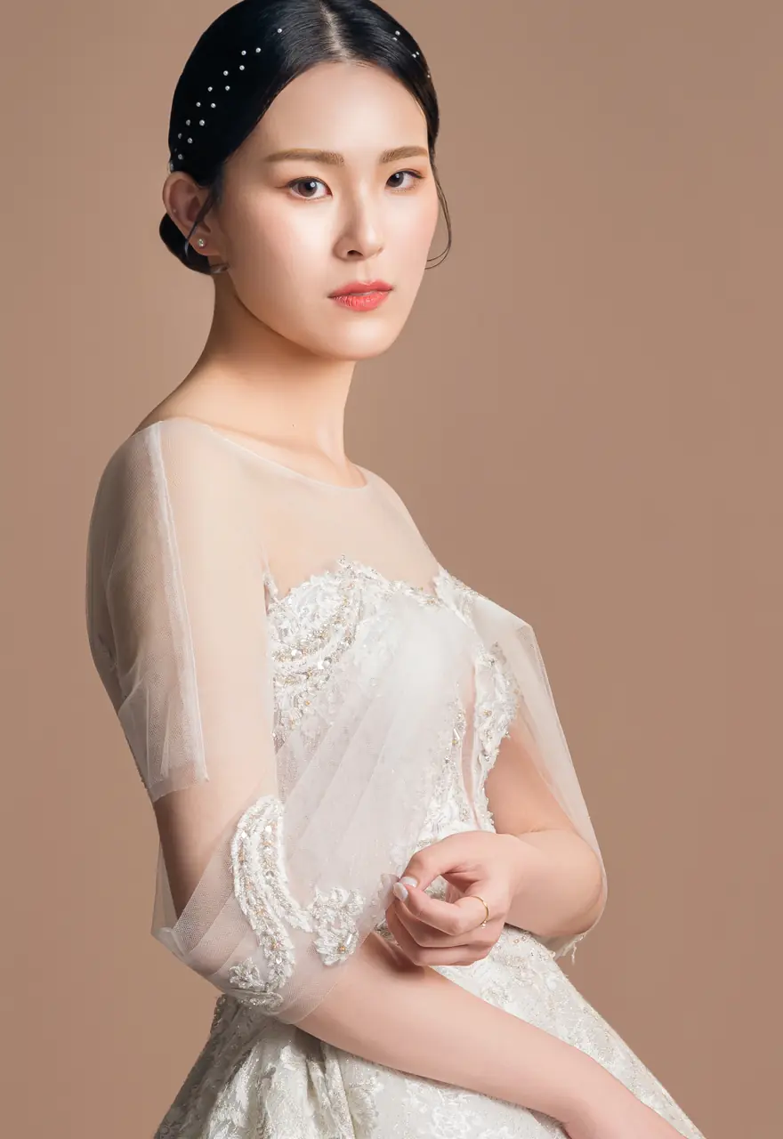 《沉香軌跡白紗禮服》是一段關於回聲的記憶書寫——以香檳色為情感的底調,如微光滲染的信箋,述說著一場柔軟卻不容抹滅的緣分。細緻的蕾絲彷彿老屋簷下的花窗,透著絲絲懷舊,V領與卡肩剪裁,如同花園午後的低語,引人窺探藏於心底的靜默激情。澎裙線條帶來古典的儀式感,輕裹一段從容的等待時光——某個回頭的瞬間,她終於站在了屬於自己的句點,也是開始。
