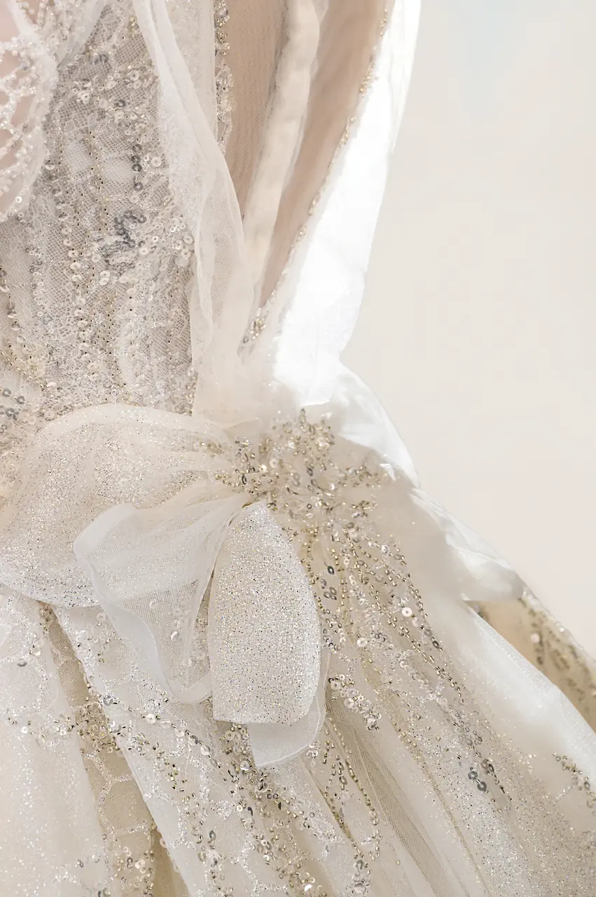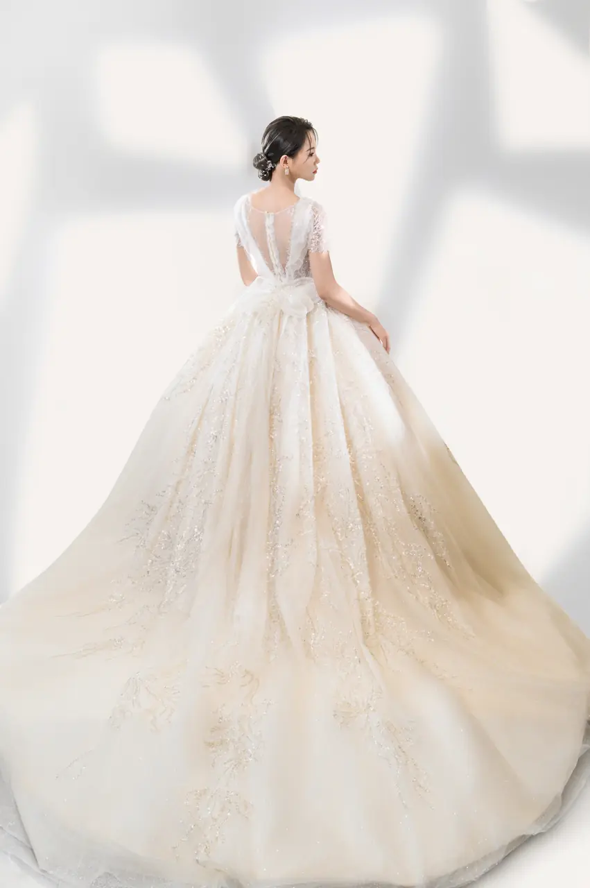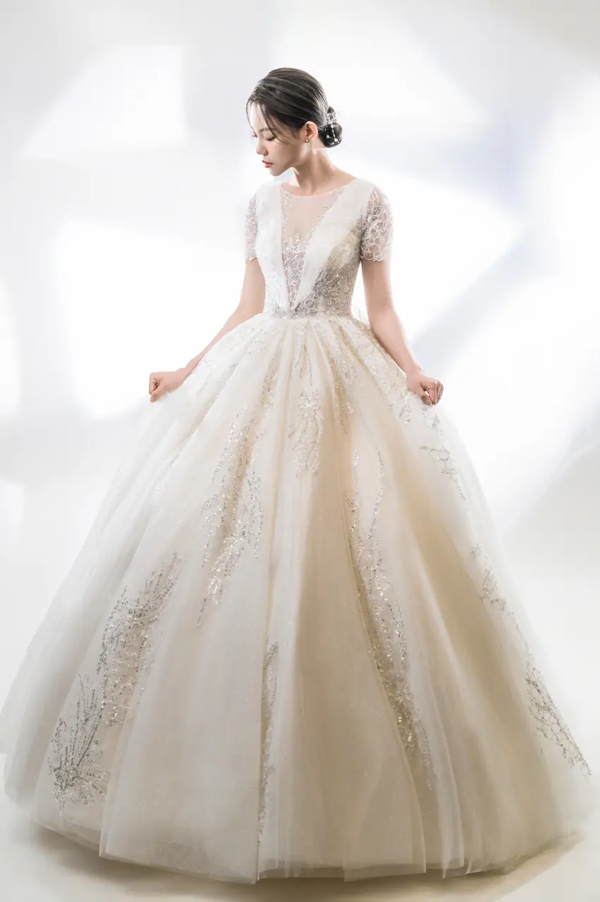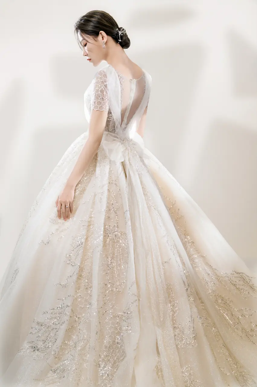 《靜羽白紗禮服》是一段深呼吸般的沉靜情緒,如晨光灑落空無一人的迴廊。澎裙宛如流動的輕羽,搭配細緻蕾絲與隱約閃爍的刺繡羽紋,如心事般躲藏於光影之下,一不留神便被照亮。桃心領口內斂卻不怯懦,呈現一種柔和的堅定。這不是誇張的歡喜,而是一種靜默的決意——選擇愛,選擇站在光中,正如她選擇這場無聲卻滿盈的盛典。