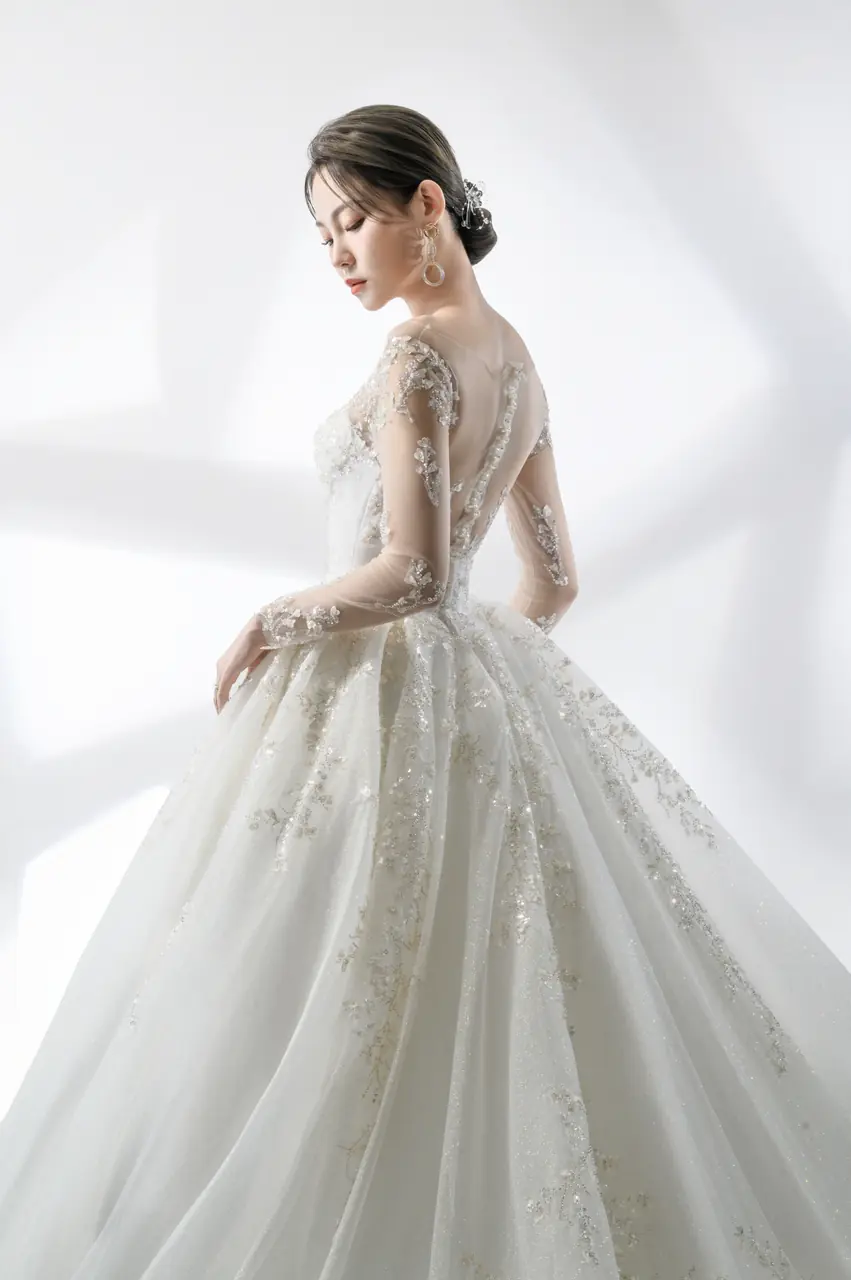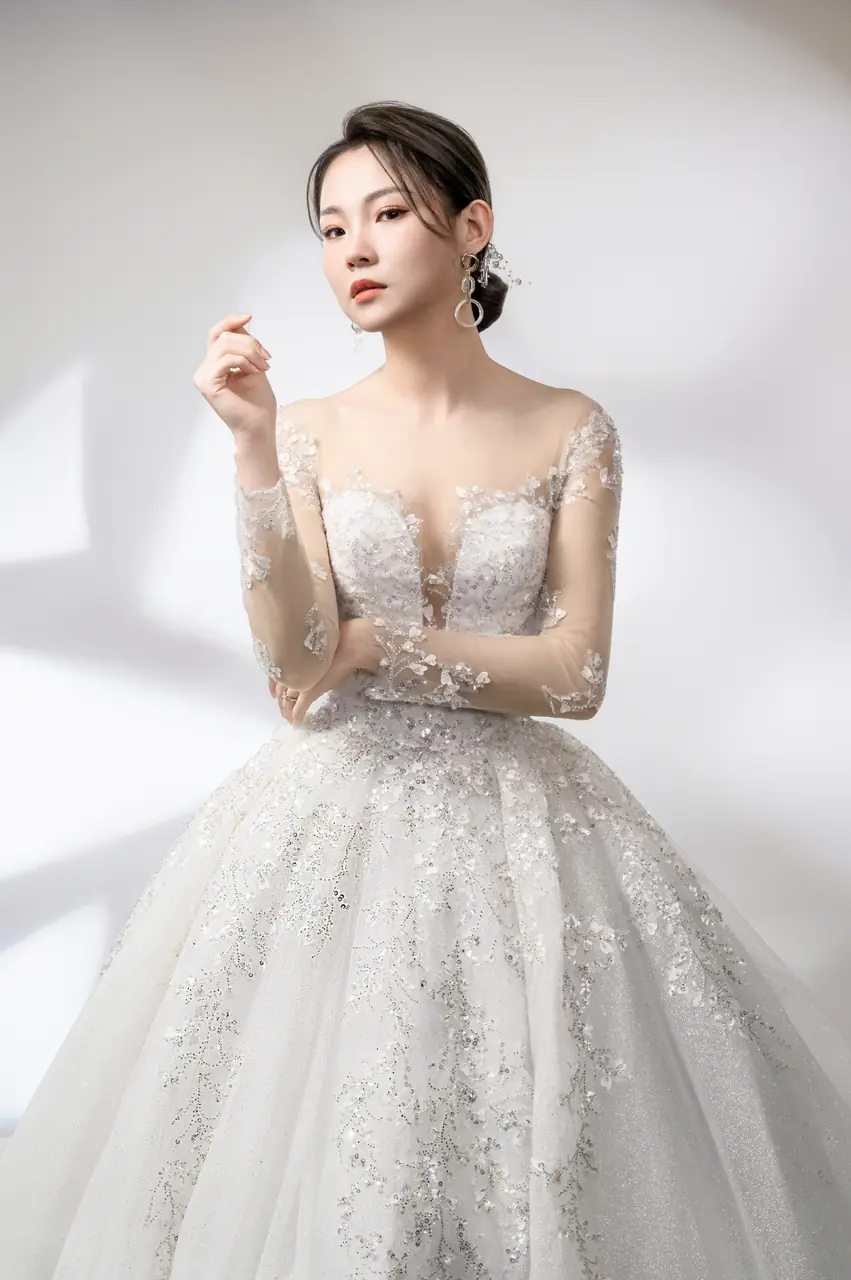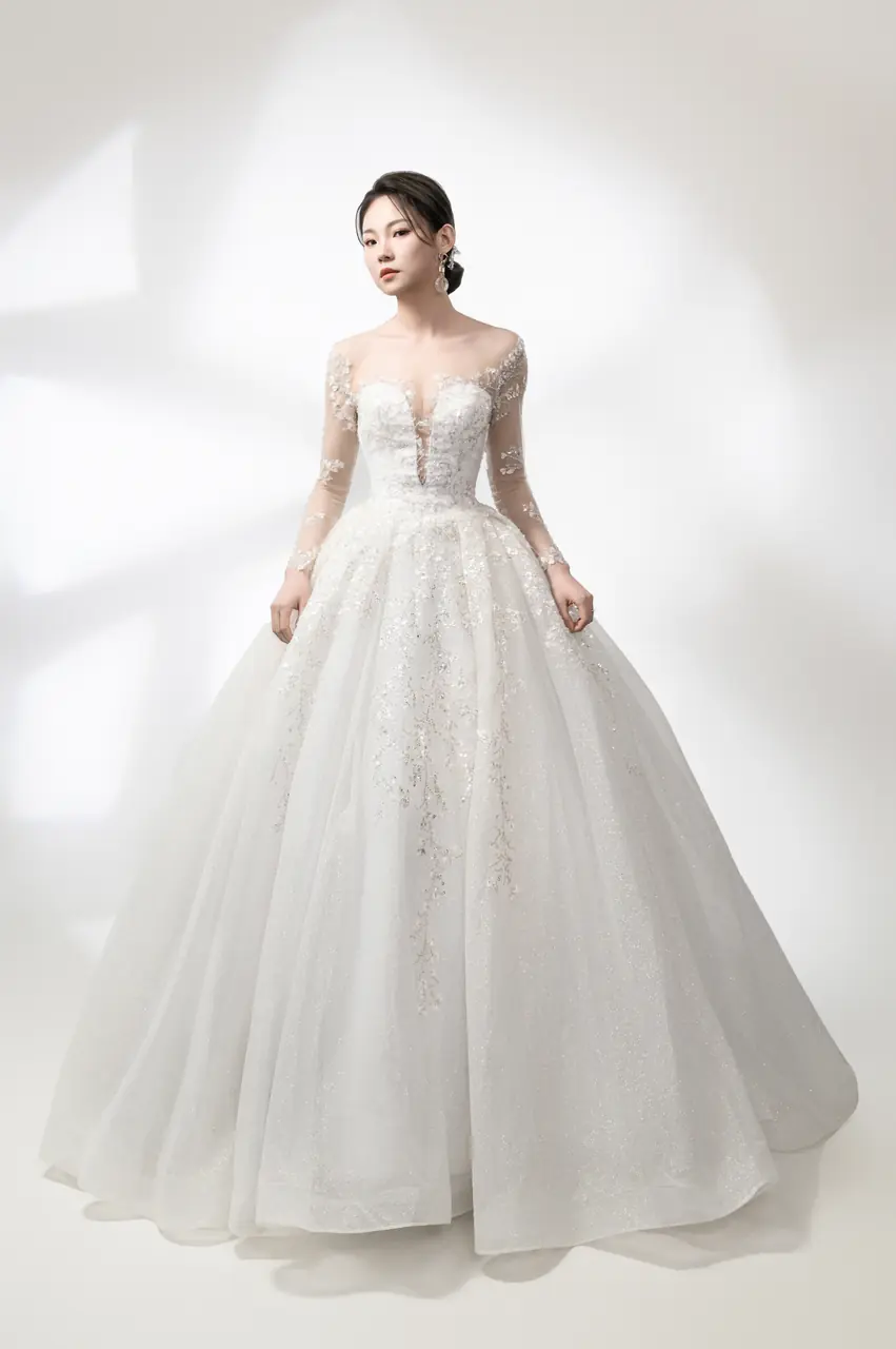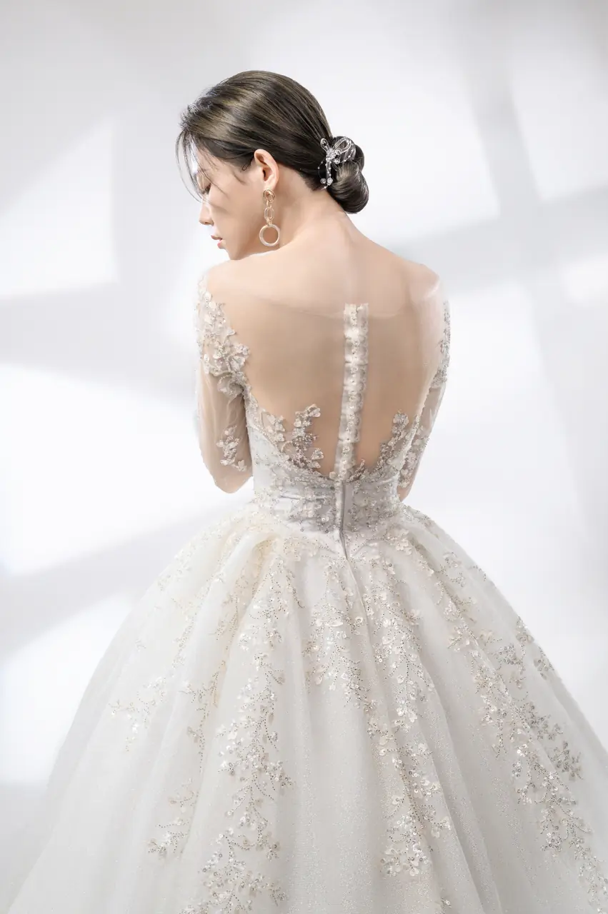 靜謐的空氣裡,有一道光穿過玻璃,落在她的肩上。這件「寂光花園白紗禮服」,以細緻刺繡和晶鑽碎光編織成夢中庭園的輪廓。桃心領的輪廓,如同一封未寫完的情書,長袖包覆著時間的溫柔,透紗上的花朵綻放在她的每一個呼吸之間。這不只是禮服,更是一場靜默的對話,一段關於等待、關於承諾的詩。她站在命運之境的邊緣,不言愛語,卻已是一切。