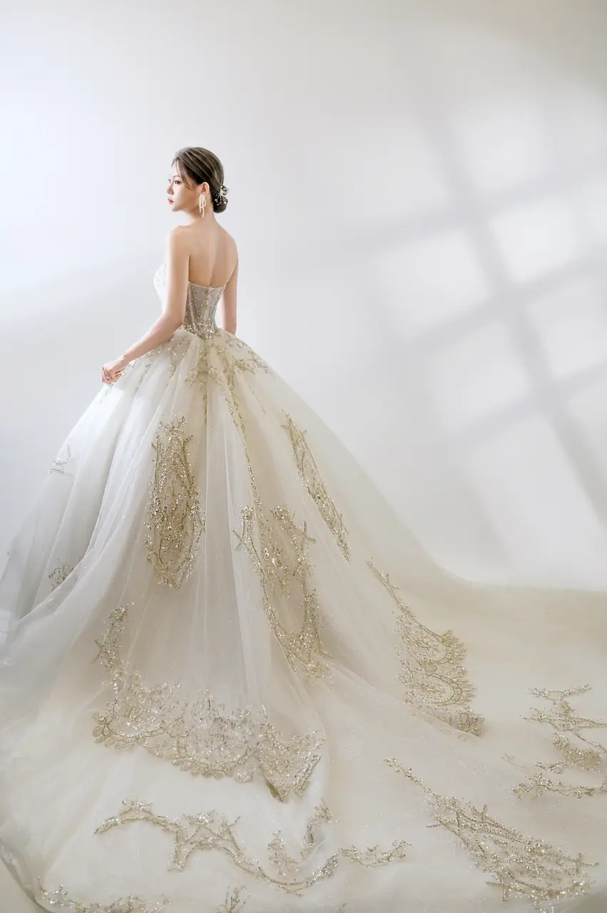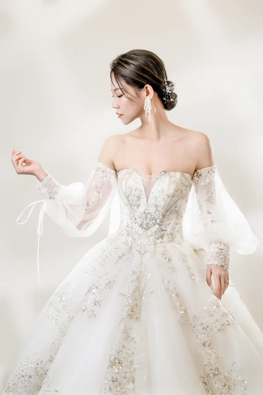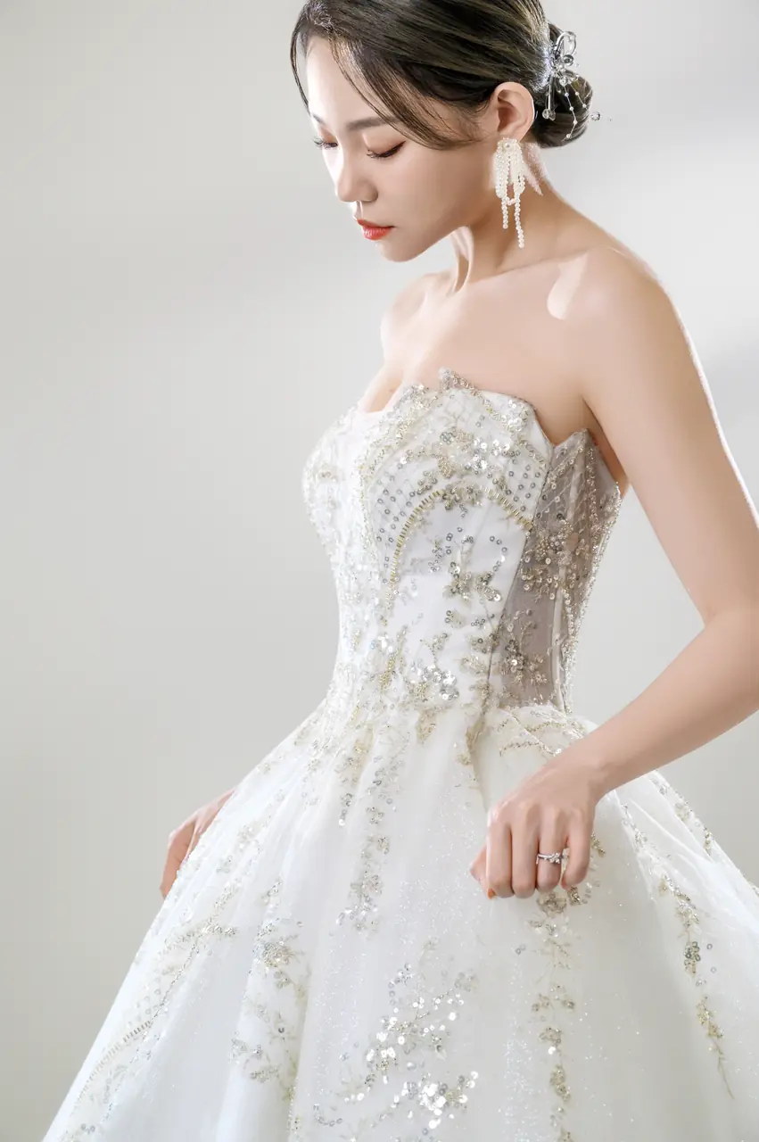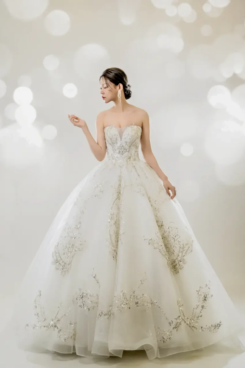 時間靜止於她打開舊時計的那一刻。靜塔綻光白紗禮服,用一筆筆銀白刺繡,將往昔的迴聲藏進層層紗緞,彷彿那座無人踏入的塔樓,唯有愛能打開。桃心領線條勾勒著內斂與純粹,澎裙之下隱著難以言說的渴望。三穿式的靈活設計讓情緒轉換如光影流轉,從儀式的隆重到晚宴的輕盈,自由書寫每一章情感場景。這不僅是一件白紗,而是關於等待與相信的具象詩篇。