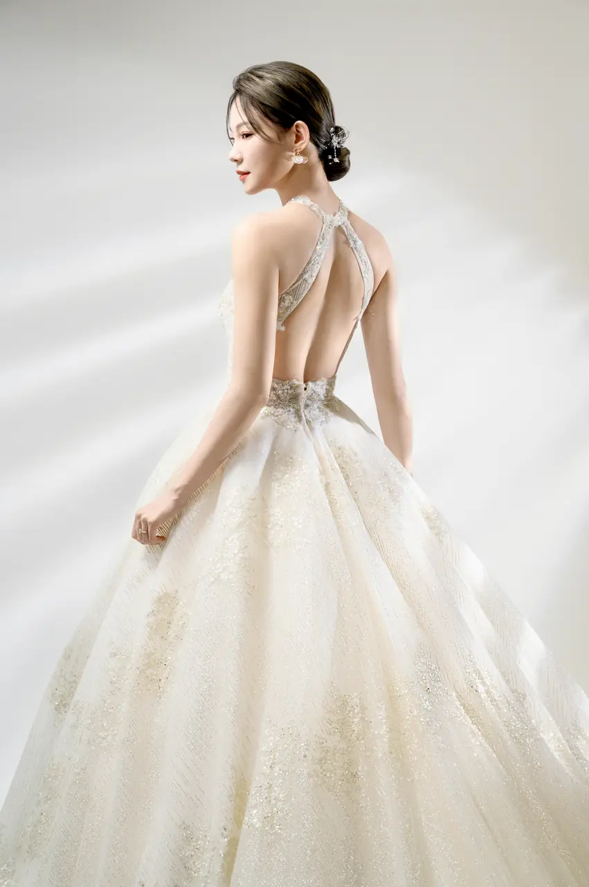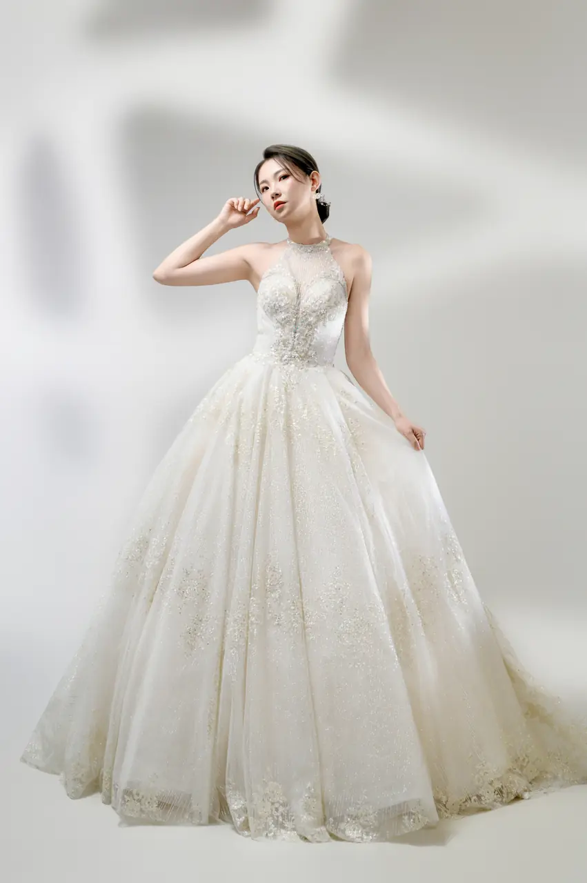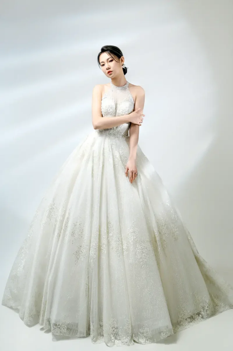 這是一場無聲的告白,在寂靜的白色之中,情感緩緩蔓延。如絲光般的細膩蕾絲覆蓋澎裙,彷彿是晨光穿透窗紗灑落的細節,一層一層述說柔和的渴望。削肩圓領線條勾勒出一種幾近純粹的堅定,彷彿她正站在自己寫下的誓言之中,不需任何言語,便能懂。這不是一件婚紗,而是一段剛剛好在心尖落下的寧靜情緒,是穿在身上的《靜語之光》。