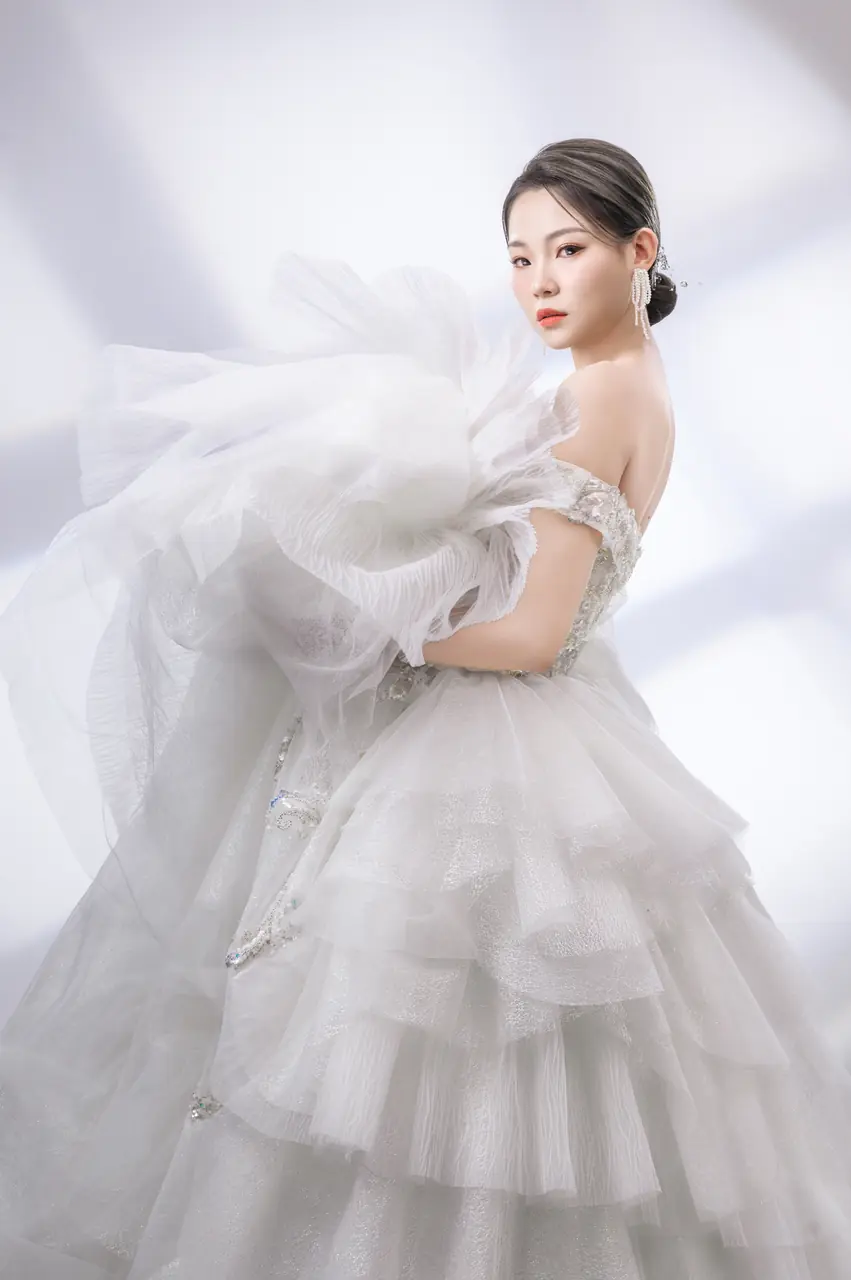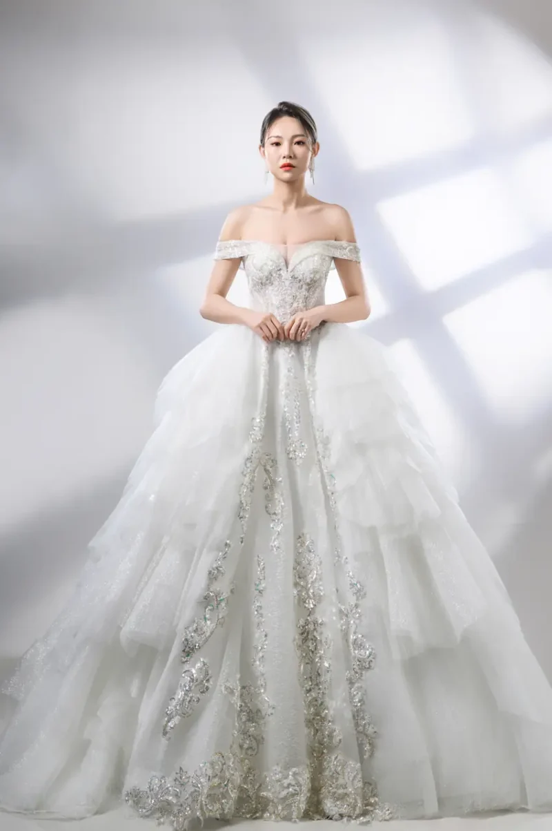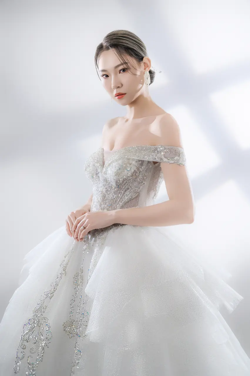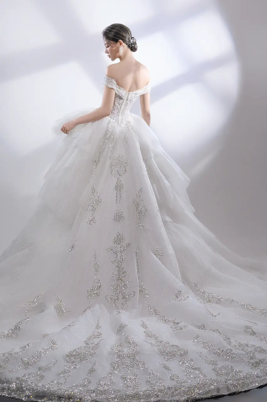 在一個被玻璃與晨光雕刻的空間裡,她站在舊世界的花園門前,光線打在沾染銀粉的蕾絲上,如同露水沉眠於初冬的月桂葉上。桃心領輕吻鎖骨,如同低語間的誠實誓言,卡肩袖微微坠落,彷彿風拂過古老石柱的曲線。裙擺隨步伐擴展,如畫布上無聲展開的銀白篇章,細緻珠繡如藤蔓爬行,洩露了她內心那份不被世俗碰觸的柔軟與神聖。這不是一件婚紗,而是時間在光裡折出的詩。