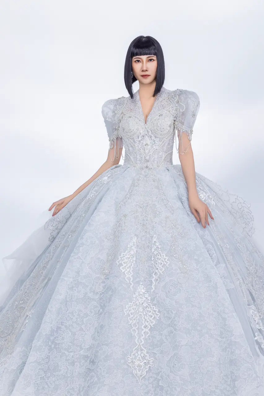 在無垠的靜白中,她如銀視界的先行者。這件白紗宛若雲霧與晨霜之間誕生的神話,以繁複蕾絲紋理織出時間的語言,V領與五分袖交織出柔韌與清醒之美。膨鬆裙擺不僅是一場儀式的延伸,更是情緒的空間,讓她行經的每一寸地面都記錄著靈魂的重量。肩上的結構設計如盔甲般輕盈,守護她從容走入命定場域。這不是夢想的投影,而是凝視自己最深處光芒的方式。