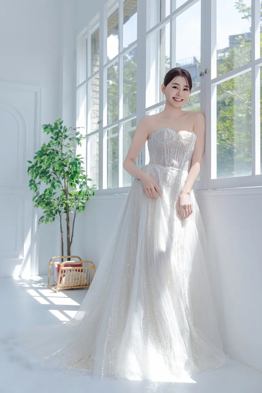 「落塵語白紗禮服」是一段被光擁抱的靜默詩篇。輕紗隨步伐緩緩流瀉,如同時間墜落窗台時的聲音 —— 無聲卻動人。桃心領勾勒微光下的柔軟線條,無袖設計則讓陽光與肌膚無界共舞。A-line剪裁輕盈垂墜,像塵埃中閃爍的小語,一字一句訴說內心深處未曾說出的誓言。這是一段關於靜謐的對話,獻給在光裡許下承諾的她。