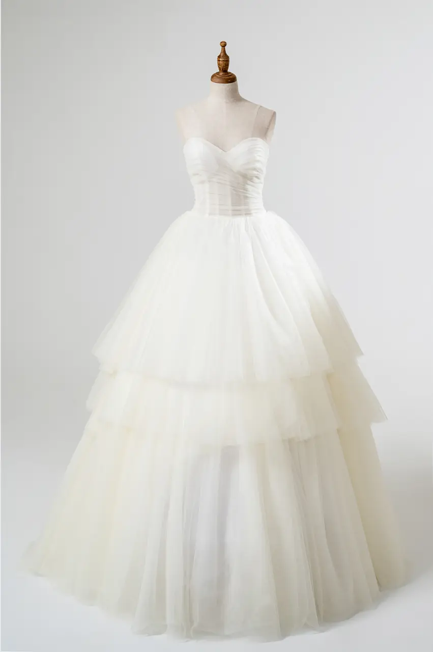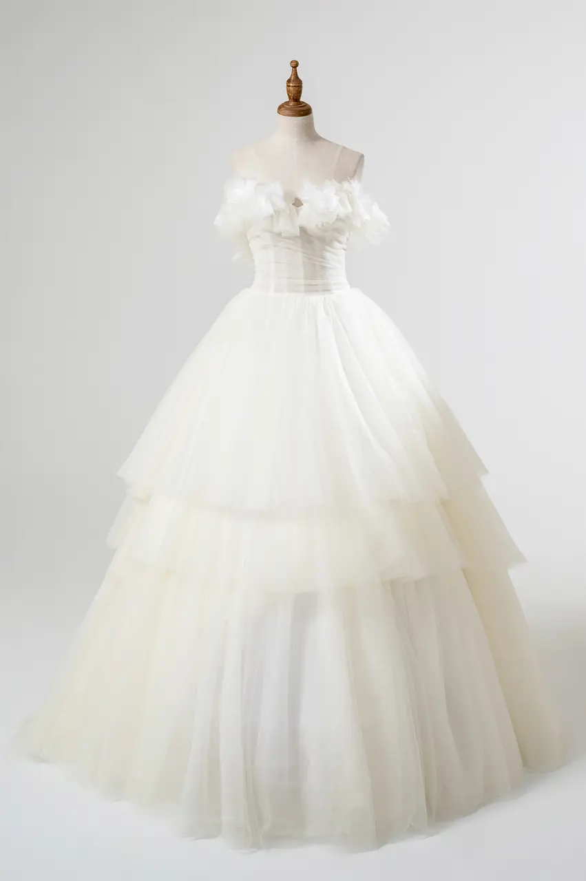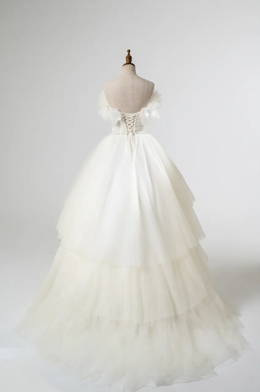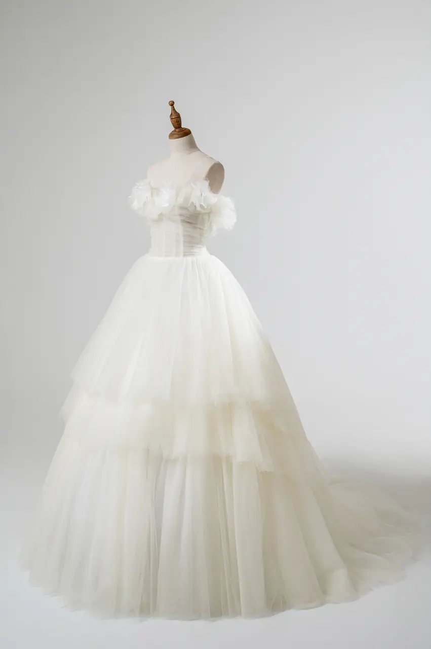 《沉香羽語白紗禮服》像是一段初雪降臨的回憶,以層疊細紗譜寫靜謐的旋律。澎裙如霧輕掩,桃心領與卡肩設計彷彿柔聲低語,輕扶過心口的悸動。它不喧譁、不張揚,只在光影交錯中,如一束柔白的香氣,輕盈地穿越時光的縫隙,為命定的那天鋪上一層純淨的寧靜。這是一位新娘在心中反覆描摹無數次的畫面,一場名為愛的等待,終於迎來她自己的篇章。