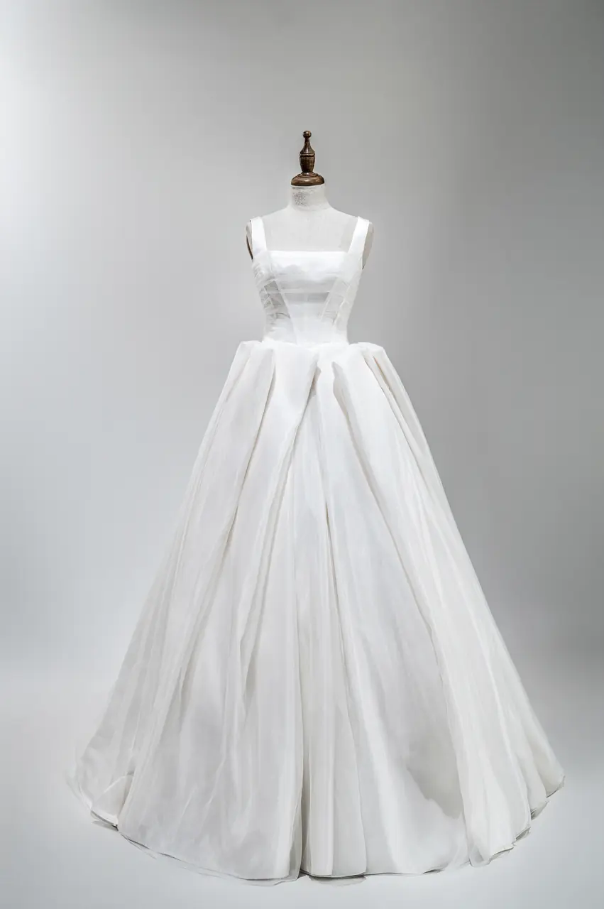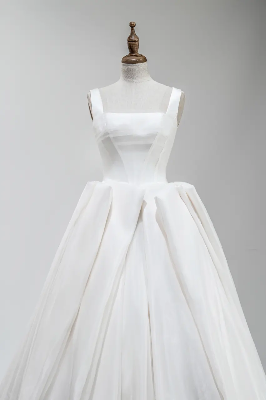 「靜白庭語婚紗」靜靜傾訴著無聲的誓言。那是一座午後無人探訪的花園,光線斜斜落下,時間似乎在一瞬凝結。方領與背心設計勾勒出線條的堅定,像是古典石柱間穩固的平衡;而綿密堆疊的白紗澎裙,則如落下的光影,柔軟卻明晰。這不只是一次穿著,而是一場對靜謐風景的召喚,訴說著內心潔淨的堅持與柔情的重量。為那些不驚不擾、堅定選擇愛的她而生。