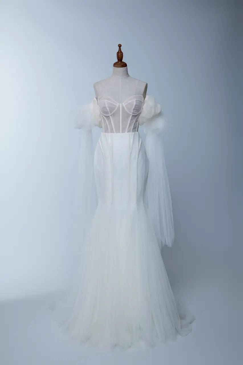 《靜域白紗禮服》是一場無聲的深潛,是在瞬息萬變的婚禮儀式中,一次內在情緒的沉澱。採以純白紗質勾勒魚尾輪廓,勻稱的線條從胸口桃心領延展至裙襬,銳利而柔和。卡肩袖口輕垂如水,宛若記憶中未說出口的話語,將人繫住在那場無風的午後。這是一件屬於孤獨與愛共存的婚紗,純粹、絕對,也帶著徬徨和安定交織的氣味。穿上它的那一刻,彷彿整個空間都在屏息,等著那句還沒說出口的「我願意」。