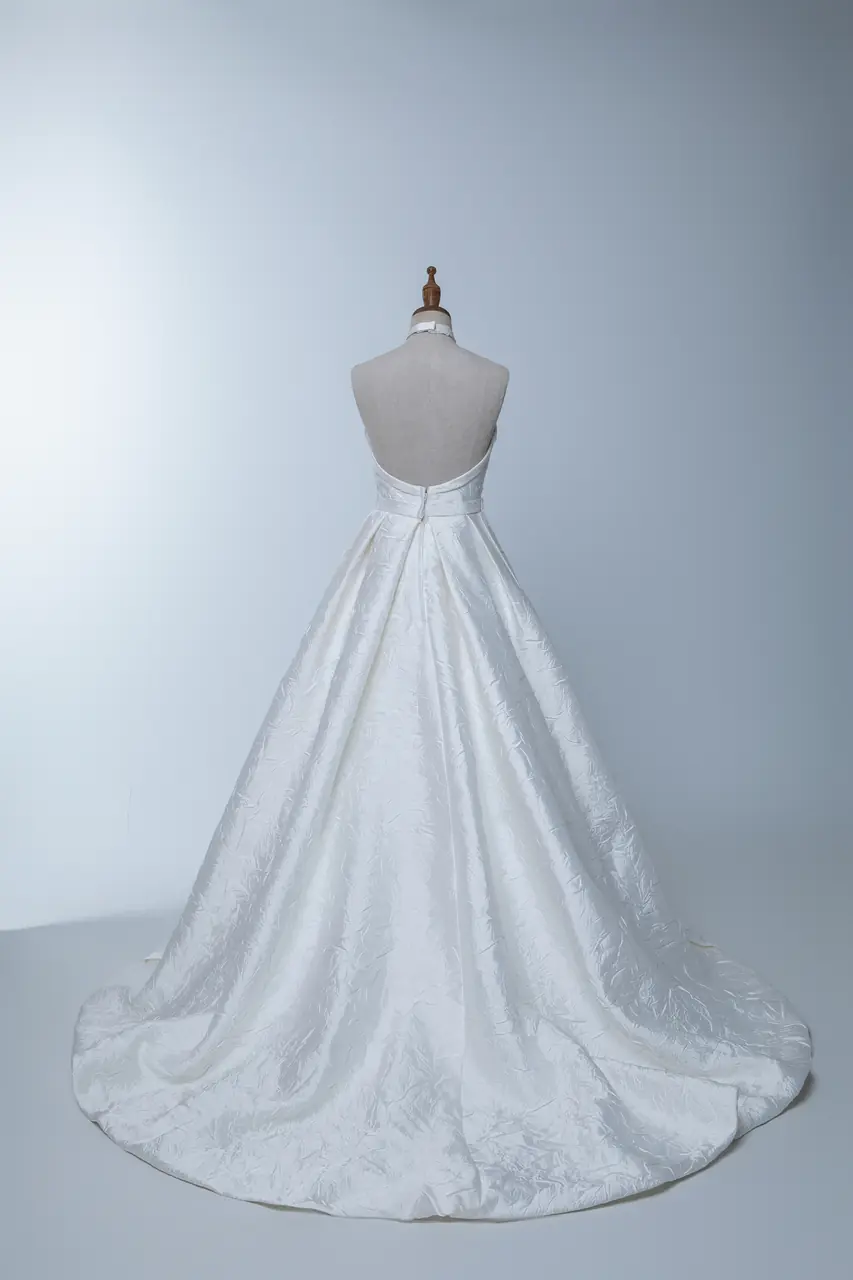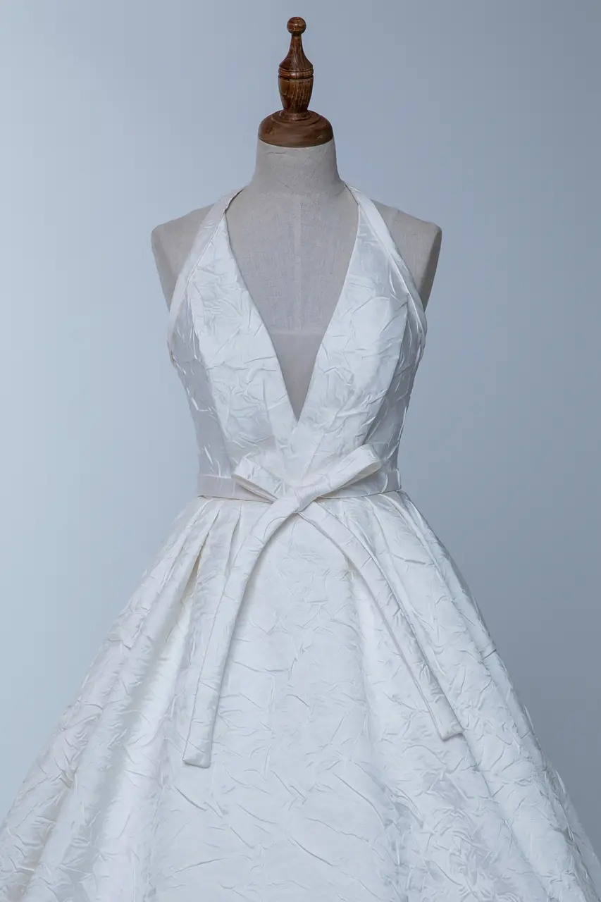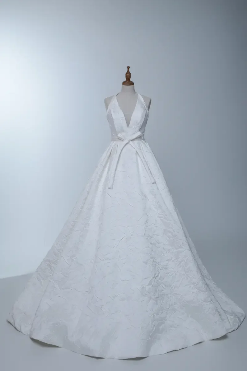 她靜靜站在光與影之間,像是隱匿於舊時碑林中的女子。緞面的質地如歷經風霜的石面,輕柔映出一道道淺刻痕跡,每一道摺紋皆是時間的回聲。削肩的輪廓與深V剪裁,像是一封不曾寄出的信,坦然、決絕,卻又溫柔。這件白紗禮服不屬於童話,它屬於一位明白沉靜也是力量的女性。如同未完成的詩,靜靜等待懂得的人看懂她的深邃與凜然。