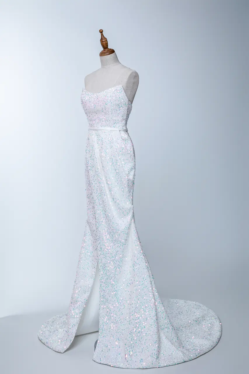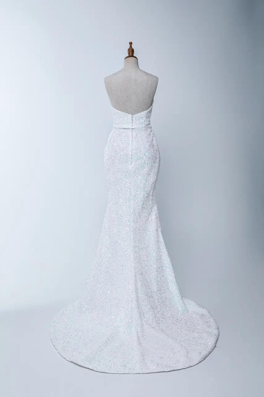 「反光靜默白紗禮服」描繪的是一段遺世獨立的等待——宛如海平面上最後一縷光,剛剛落入她肩上的那瞬。紗質織就出流動的銀白,細緻閃爍不張揚,如夜晚深夢裡潛藏的心願。魚尾貼身流線彷彿時間靜止,是她迎接命運時的決然姿態。桃心領弧度溫柔而堅定,讓所有耀眼的光從這裡開始出發,像是沉默中所有尚未說出的愛與承諾,在此刻全然無聲綻放。