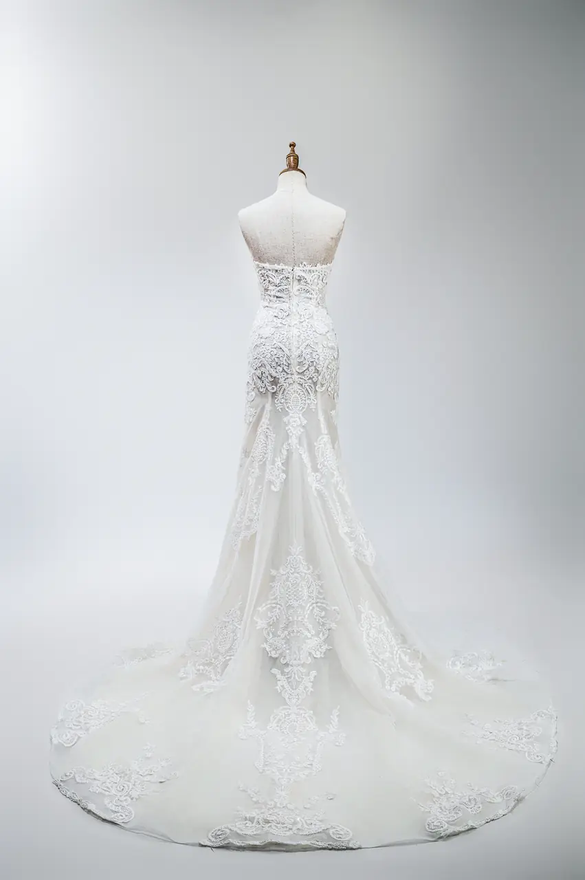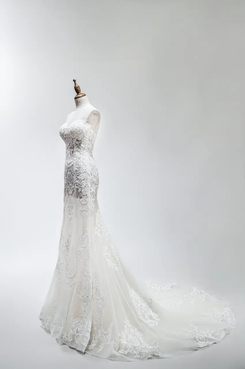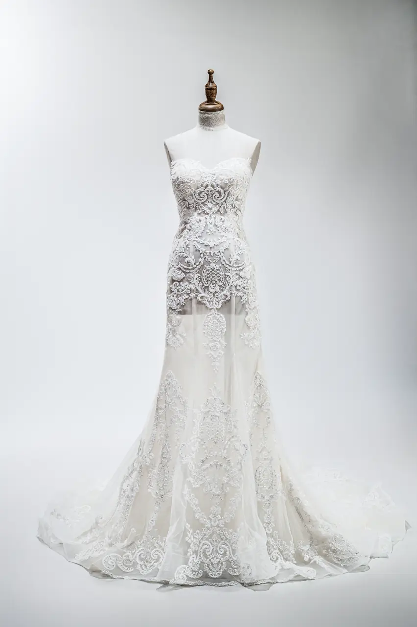 這是一襲有著低語靈魂的白紗,彷彿誕生自某個靜謐午後的歐洲石亭,陽光如細沙灑落,風輕輕掀起薄紗的邊角。魚尾剪裁貼合身形,承襲古老建築的對稱與細節,由繁複蕾絲構築整體語彙 —— 是愛情的詩篇,更是靈魂的浮雕。每一道弧線,都像鐘聲未盡的回音,訴說著,那一刻,妳在等;這一刻,一生只為與妳共舞。