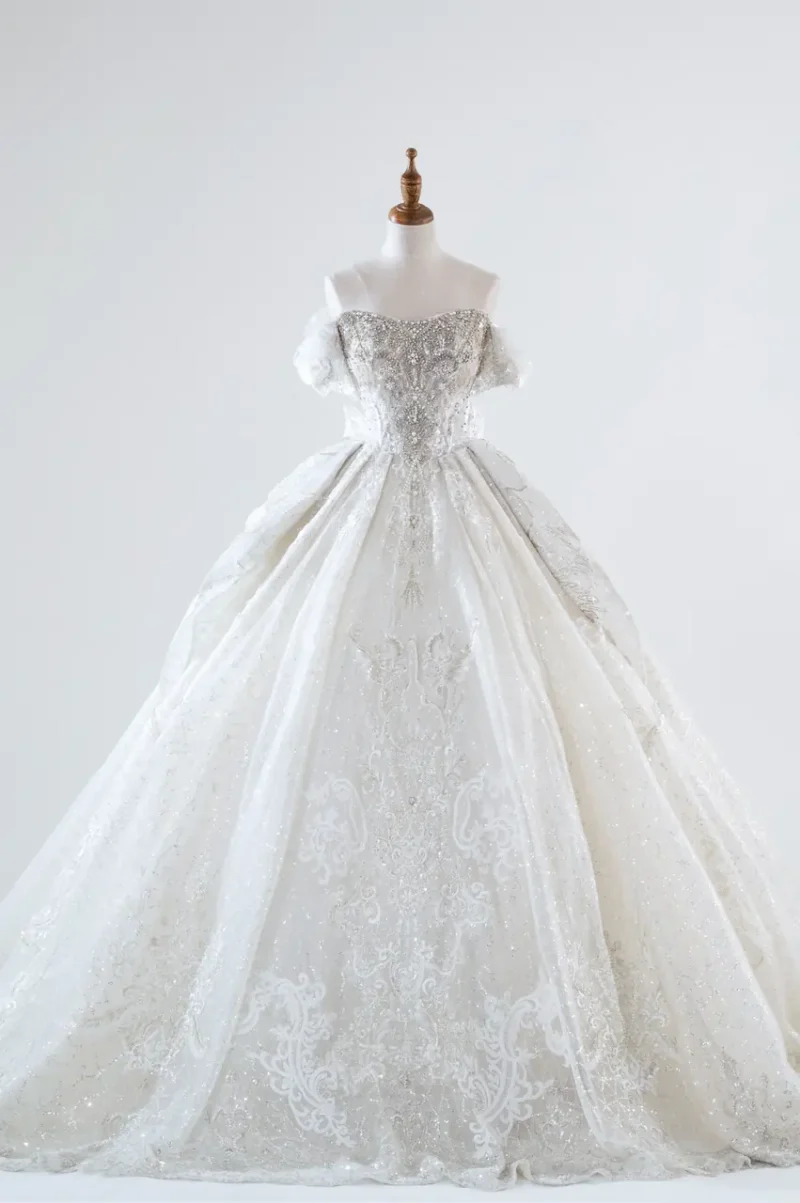 這不是一件婚紗,而是一場被定格的樂章。銀譜序曲白紗禮服,如同從十九世紀宮廷樂章中走出的奏者,在每一道蕾絲曲線與手工珠飾間編織情緒的波瀾。卡肩設計彷彿墜落的和絃,勾勒出不言的渴望與柔軟的堅定;澎裙如聲場的餘韻,在空氣中泛起一圈圈白色渦流。她穿上它時,彷彿走進一座無人教堂,光穿過高窗灑下,是莊嚴、是純白、是心中的第一次渴望永恆的聲音。