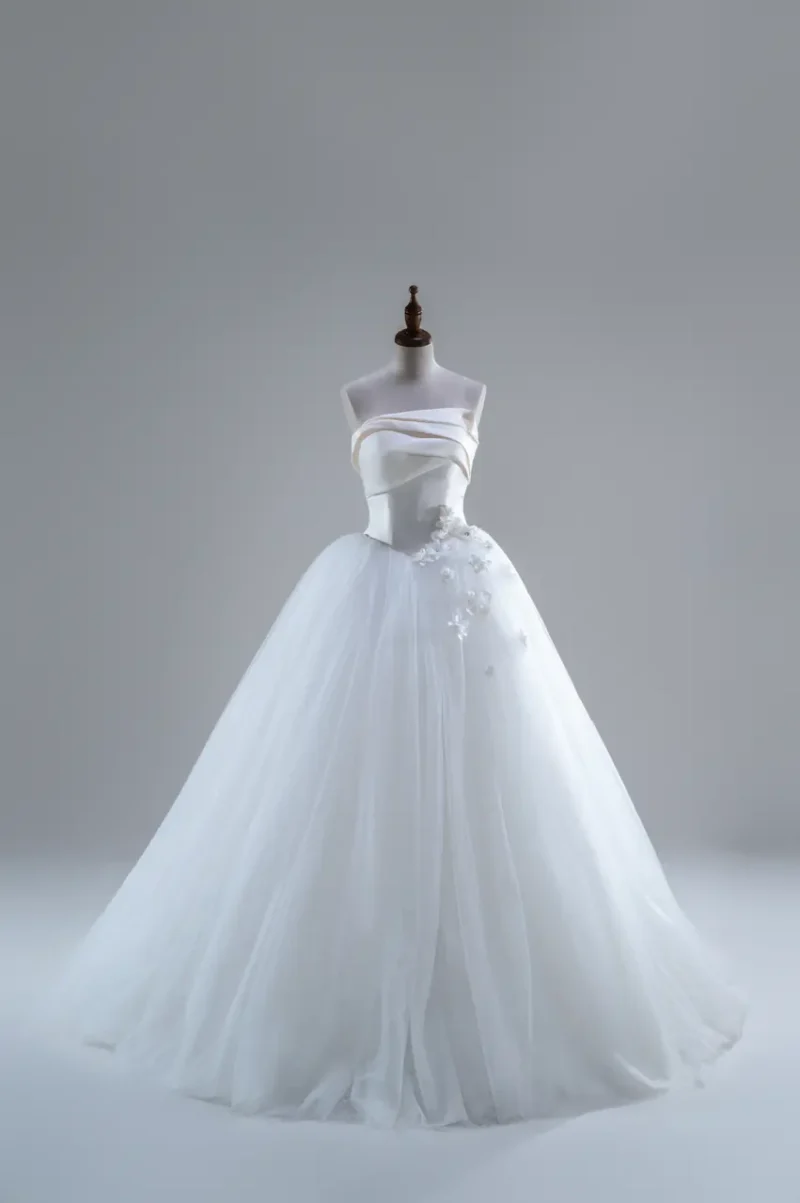 這件名為「靜白辭」的婚紗,像是一首在黎明前低語的詩。白色薄紗疊出空氣的質地,胸口斜落的摺線彷彿風的流向,彎曲地依附於胸骨之上。裙襬澎湃卻不喧囂,蓬鬆如雲的重量藏起她將說未說的感情。在腰間微歪處,數朵立體手工花緩緩綻放,彷彿難以出口的情話終於被悄悄放下。這不是一件白紗,它是一段沉靜卻濃烈的情緒,是女孩在心底深處,對未來輕聲許下的自由誓言。