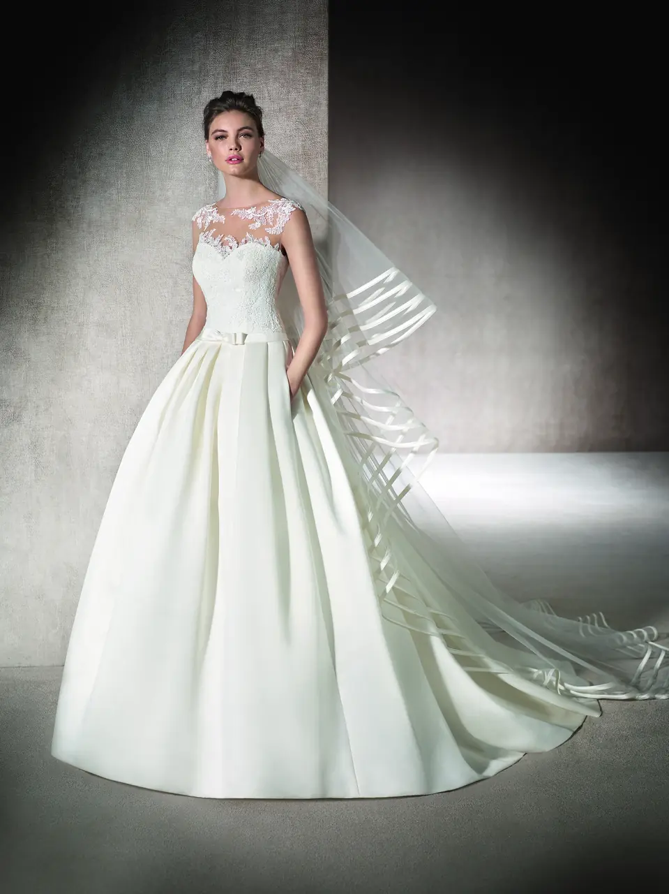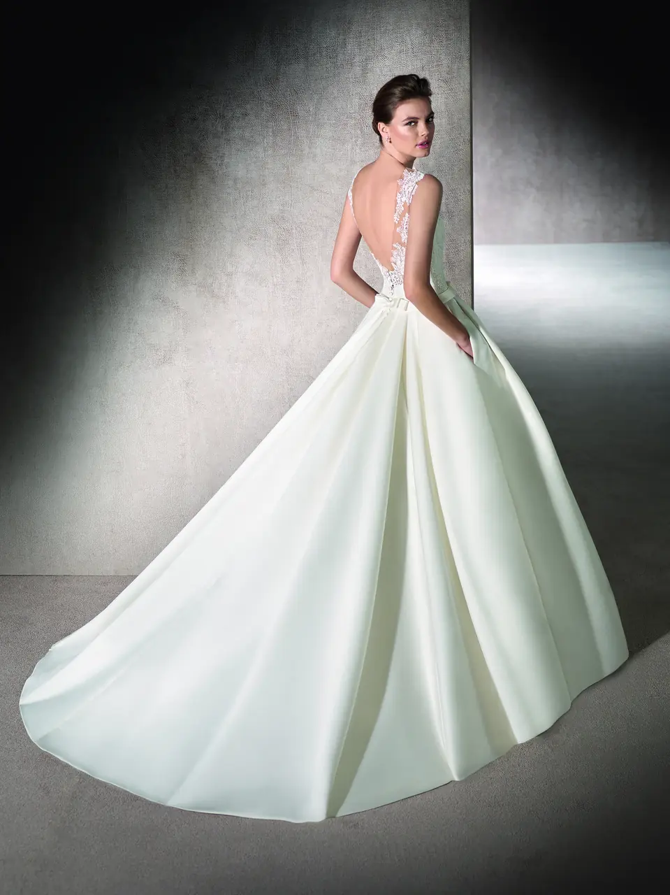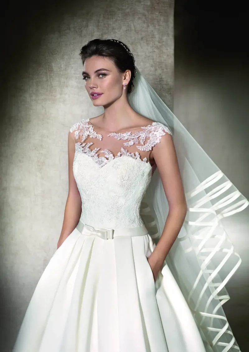 在黎明初醒的花園中,她輕踏著晨露凝結的綠意,仿佛一幅畫卷中悠然降臨的仙子。這件婚紗如晨光般柔和,以桃心領展現她內心無懼的愛,澎裙的緞面隨步履蕩漾出如詩般的節奏。在這個特別的日子,她不只是新娘,更是夢中微風輕吻的主角,帶著她獨特的故事綻放光芒。