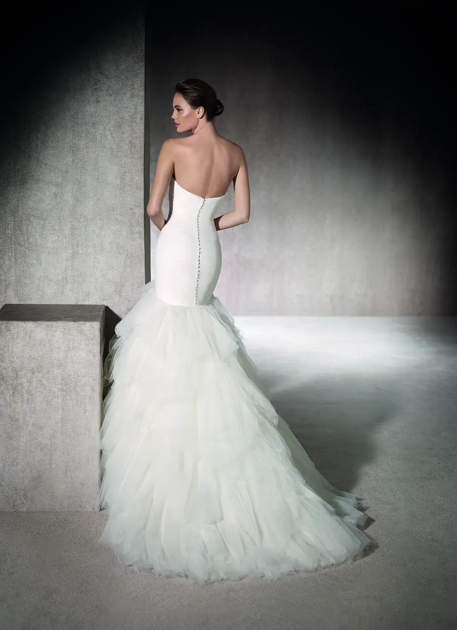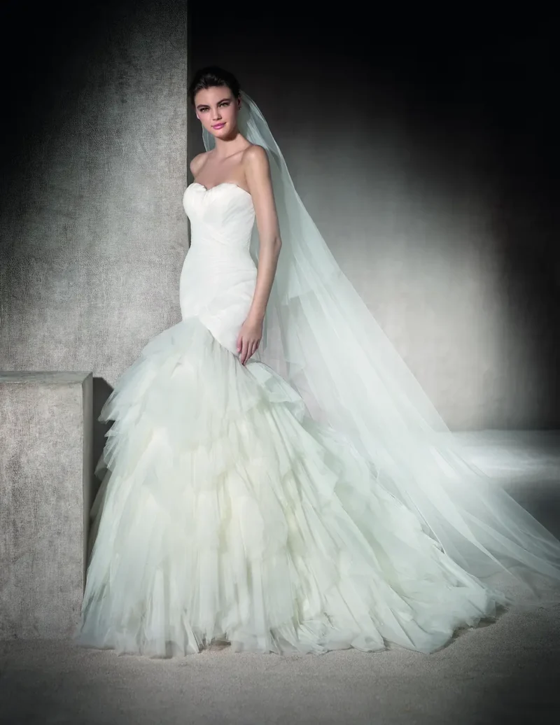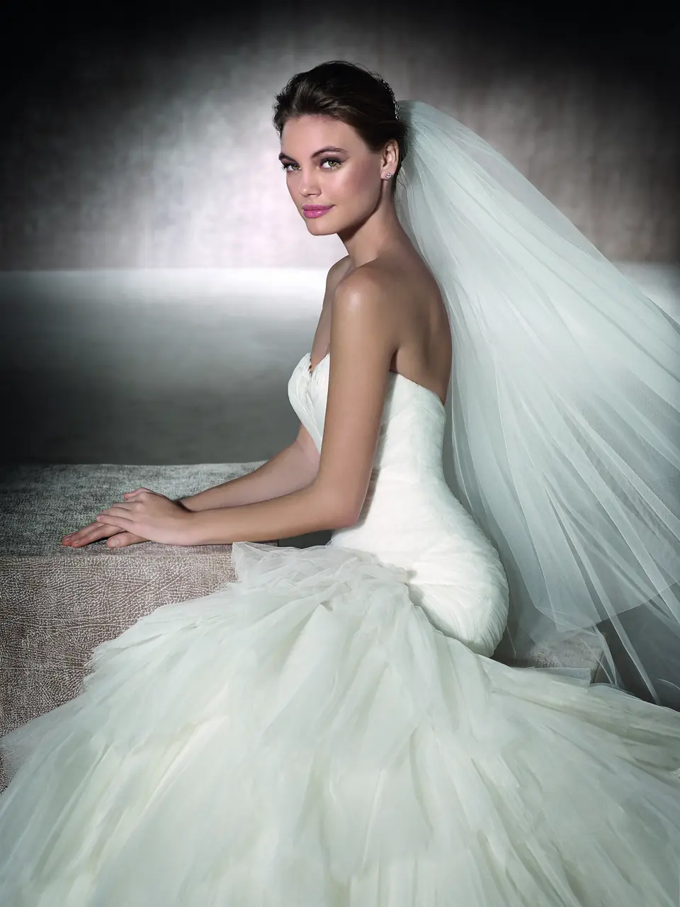 當黎明的微光輕觸大地,她在霧中輕盈現身,如影般柔和而神秘。這套婚紗如同新娘的心聲,於無聲中呢喃著對永恆的期許。柔紗隨著她的步伐輕舞,如白色夢境一般,將她的優雅與深情映照在每一片晨光之中。她的故事在每一步間展開,靜謐而充滿力量,喚醒每一刻的珍貴。