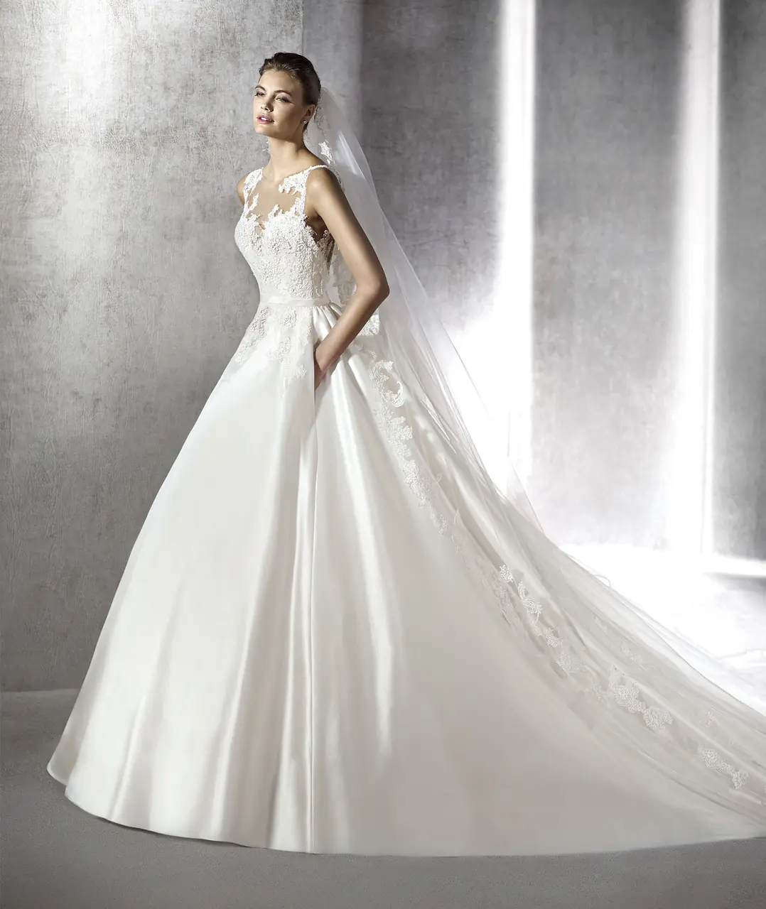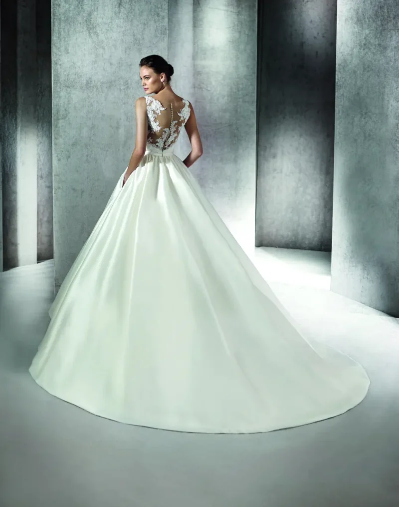 這件婚紗宛如晨霧,裊裊輕舞於花園小徑。澎裙的流動讓新娘如同在夢境中舞蹈,而緞面的光澤與V領的設計則如同初曦的黎明,輕盈卻充滿力量。當她輕輕轉身,身後紗裙如霧般輕擁,承載著那抹微笑與一生的誓言。