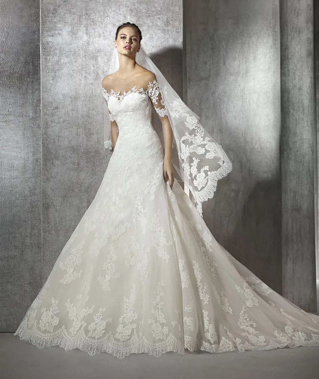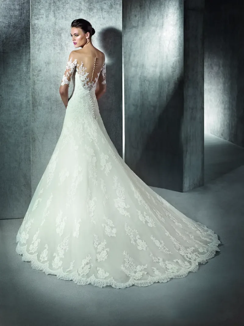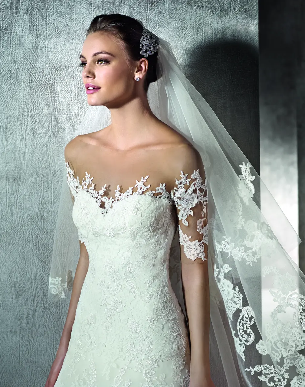 這件婚紗猶如一曲在靜謐黎明中輕唱的小夜曲,將新娘包裹於柔和的蕾絲之中。霧氣環繞下,她彷若從夢境中走來,隱約透現出她心底的渴望與柔情。步入禮堂的瞬間,她是獨特的存在,讓人感受到時間的停滯,與永恆的誓言共舞。